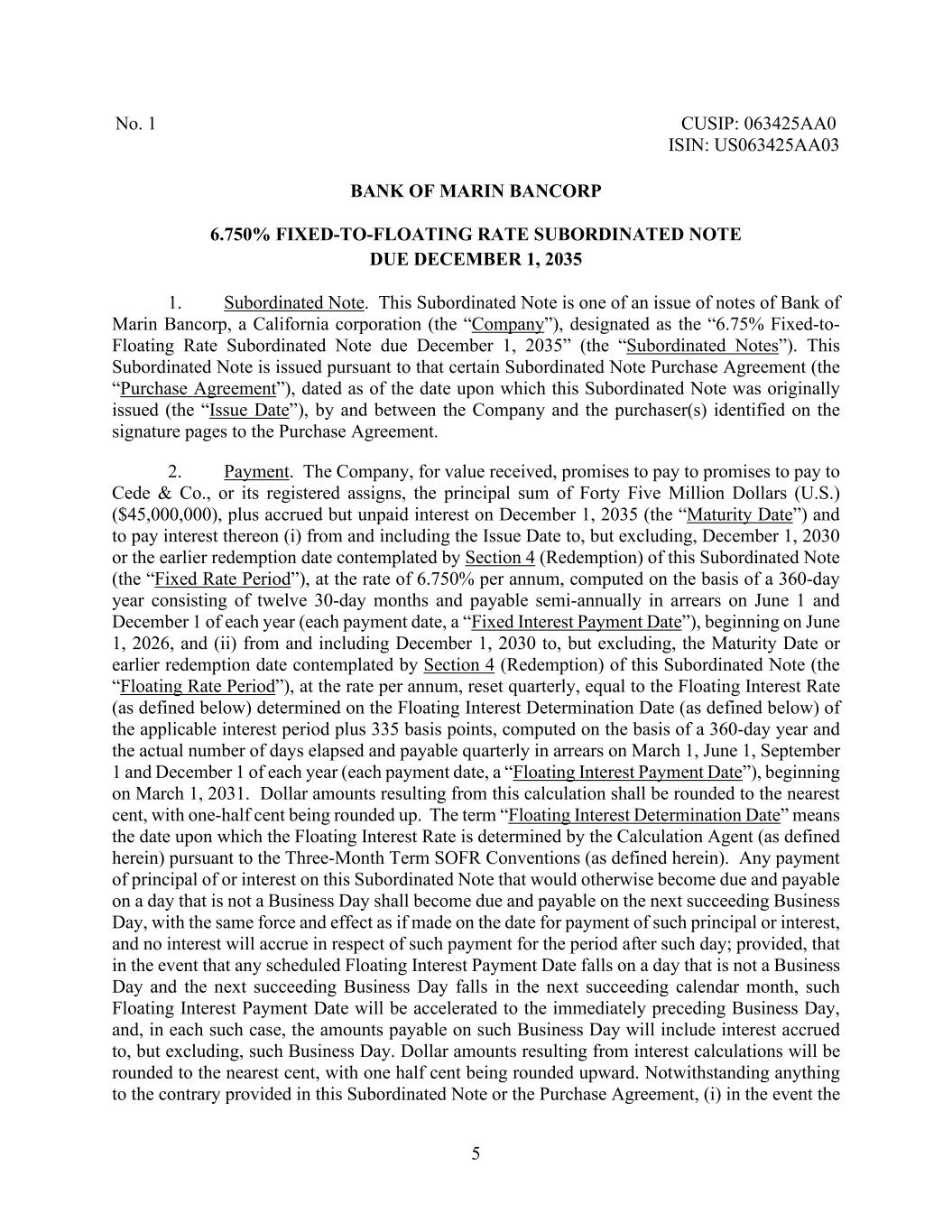 5 No. 1 CUSIP: 063425AA0 ISIN: US063425AA03 BANK OF MARIN BANCORP 6.750% FIXED-TO-FLOATING RATE SUBORDINATED NOTE DUE DECEMBER 1, 2035 1. Subordinated Note. This Subordinated Note is one of an issue of notes of Bank of Marin Bancorp, a California corporation (the “Company”), designated as the “6.75% Fixed-to- Floating Rate Subordinated Note due December 1, 2035” (the “Subordinated Notes”). This Subordinated Note is issued pursuant to that certain Subordinated Note Purchase Agreement (the “Purchase Agreement”), dated as of the date upon which this Subordinated Note was originally issued (the “Issue Date”), by and between the Company and the purchaser(s) identified on the signature pages to the Purchase Agreement. 2. Payment. The Company, for value received, promises to pay to promises to pay to Cede & Co., or its registered assigns, the principal sum of Forty Five Million Dollars (U.S.) ($45,000,000), plus accrued but unpaid interest on December 1, 2035 (the “Maturity Date”) and to pay interest thereon (i) from and including the Issue Date to, but excluding, December 1, 2030 or the earlier redemption date contemplated by Section 4 (Redemption) of this Subordinated Note (the “Fixed Rate Period”), at the rate of 6.750% per annum, computed on the basis of a 360-day year consisting of twelve 30-day months and payable semi-annually in arrears on June 1 and December 1 of each year (each payment date, a “Fixed Interest Payment Date”), beginning on June 1, 2026, and (ii) from and including December 1, 2030 to, but excluding, the Maturity Date or earlier redemption date contemplated by Section 4 (Redemption) of this Subordinated Note (the “Floating Rate Period”), at the rate per annum, reset quarterly, equal to the Floating Interest Rate (as defined below) determined on the Floating Interest Determination Date (as defined below) of the applicable interest period plus 335 basis points, computed on the basis of a 360-day year and the actual number of days elapsed and payable quarterly in arrears on March 1, June 1, September 1 and December 1 of each year (each payment date, a “Floating Interest Payment Date”), beginning on March 1, 2031. Dollar amounts resulting from this calculation shall be rounded to the nearest cent, with one-half cent being rounded up. The term “Floating Interest Determination Date” means the date upon which the Floating Interest Rate is determined by the Calculation Agent (as defined herein) pursuant to the Three-Month Term SOFR Conventions (as defined herein). Any payment of principal of or interest on this Subordinated Note that would otherwise become due and payable on a day that is not a Business Day shall become due and payable on the next succeeding Business Day, with the same force and effect as if made on the date for payment of such principal or interest, and no interest will accrue in respect of such payment for the period after such day; provided, that in the event that any scheduled Floating Interest Payment Date falls on a day that is not a Business Day and the next succeeding Business Day falls in the next succeeding calendar month, such Floating Interest Payment Date will be accelerated to the immediately preceding Business Day, and, in each such case, the amounts payable on such Business Day will include interest accrued to, but excluding, such Business Day. Dollar amounts resulting from interest calculations will be rounded to the nearest cent, with one half cent being rounded upward. Notwithstanding anything to the contrary provided in this Subordinated Note or the Purchase Agreement, (i) in the event the
