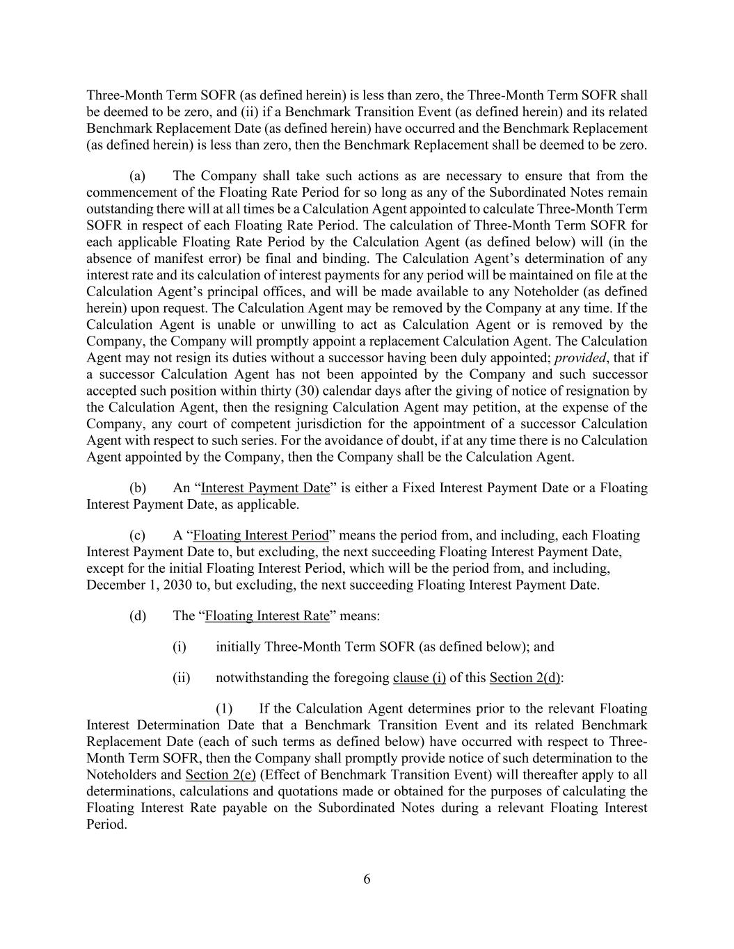 6 Three-Month Term SOFR (as defined herein) is less than zero, the Three-Month Term SOFR shall be deemed to be zero, and (ii) if a Benchmark Transition Event (as defined herein) and its related Benchmark Replacement Date (as defined herein) have occurred and the Benchmark Replacement (as defined herein) is less than zero, then the Benchmark Replacement shall be deemed to be zero. (a) The Company shall take such actions as are necessary to ensure that from the commencement of the Floating Rate Period for so long as any of the Subordinated Notes remain outstanding there will at all times be a Calculation Agent appointed to calculate Three-Month Term SOFR in respect of each Floating Rate Period. The calculation of Three-Month Term SOFR for each applicable Floating Rate Period by the Calculation Agent (as defined below) will (in the absence of manifest error) be final and binding. The Calculation Agent’s determination of any interest rate and its calculation of interest payments for any period will be maintained on file at the Calculation Agent’s principal offices, and will be made available to any Noteholder (as defined herein) upon request. The Calculation Agent may be removed by the Company at any time. If the Calculation Agent is unable or unwilling to act as Calculation Agent or is removed by the Company, the Company will promptly appoint a replacement Calculation Agent. The Calculation Agent may not resign its duties without a successor having been duly appointed; provided, that if a successor Calculation Agent has not been appointed by the Company and such successor accepted such position within thirty (30) calendar days after the giving of notice of resignation by the Calculation Agent, then the resigning Calculation Agent may petition, at the expense of the Company, any court of competent jurisdiction for the appointment of a successor Calculation Agent with respect to such series. For the avoidance of doubt, if at any time there is no Calculation Agent appointed by the Company, then the Company shall be the Calculation Agent. (b) An “Interest Payment Date” is either a Fixed Interest Payment Date or a Floating Interest Payment Date, as applicable. (c) A “Floating Interest Period” means the period from, and including, each Floating Interest Payment Date to, but excluding, the next succeeding Floating Interest Payment Date, except for the initial Floating Interest Period, which will be the period from, and including, December 1, 2030 to, but excluding, the next succeeding Floating Interest Payment Date. (d) The “Floating Interest Rate” means: (i) initially Three-Month Term SOFR (as defined below); and (ii) notwithstanding the foregoing clause (i) of this Section 2(d): (1) If the Calculation Agent determines prior to the relevant Floating Interest Determination Date that a Benchmark Transition Event and its related Benchmark Replacement Date (each of such terms as defined below) have occurred with respect to Three- Month Term SOFR, then the Company shall promptly provide notice of such determination to the Noteholders and Section 2(e) (Effect of Benchmark Transition Event) will thereafter apply to all determinations, calculations and quotations made or obtained for the purposes of calculating the Floating Interest Rate payable on the Subordinated Notes during a relevant Floating Interest Period.