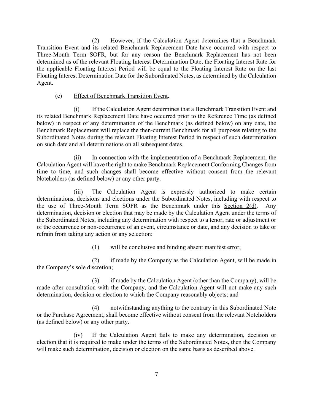 7 (2) However, if the Calculation Agent determines that a Benchmark Transition Event and its related Benchmark Replacement Date have occurred with respect to Three-Month Term SOFR, but for any reason the Benchmark Replacement has not been determined as of the relevant Floating Interest Determination Date, the Floating Interest Rate for the applicable Floating Interest Period will be equal to the Floating Interest Rate on the last Floating Interest Determination Date for the Subordinated Notes, as determined by the Calculation Agent. (e) Effect of Benchmark Transition Event. (i) If the Calculation Agent determines that a Benchmark Transition Event and its related Benchmark Replacement Date have occurred prior to the Reference Time (as defined below) in respect of any determination of the Benchmark (as defined below) on any date, the Benchmark Replacement will replace the then-current Benchmark for all purposes relating to the Subordinated Notes during the relevant Floating Interest Period in respect of such determination on such date and all determinations on all subsequent dates. (ii) In connection with the implementation of a Benchmark Replacement, the Calculation Agent will have the right to make Benchmark Replacement Conforming Changes from time to time, and such changes shall become effective without consent from the relevant Noteholders (as defined below) or any other party. (iii) The Calculation Agent is expressly authorized to make certain determinations, decisions and elections under the Subordinated Notes, including with respect to the use of Three-Month Term SOFR as the Benchmark under this Section 2(d). Any determination, decision or election that may be made by the Calculation Agent under the terms of the Subordinated Notes, including any determination with respect to a tenor, rate or adjustment or of the occurrence or non-occurrence of an event, circumstance or date, and any decision to take or refrain from taking any action or any selection: (1) will be conclusive and binding absent manifest error; (2) if made by the Company as the Calculation Agent, will be made in the Company’s sole discretion; (3) if made by the Calculation Agent (other than the Company), will be made after consultation with the Company, and the Calculation Agent will not make any such determination, decision or election to which the Company reasonably objects; and (4) notwithstanding anything to the contrary in this Subordinated Note or the Purchase Agreement, shall become effective without consent from the relevant Noteholders (as defined below) or any other party. (iv) If the Calculation Agent fails to make any determination, decision or election that it is required to make under the terms of the Subordinated Notes, then the Company will make such determination, decision or election on the same basis as described above.
