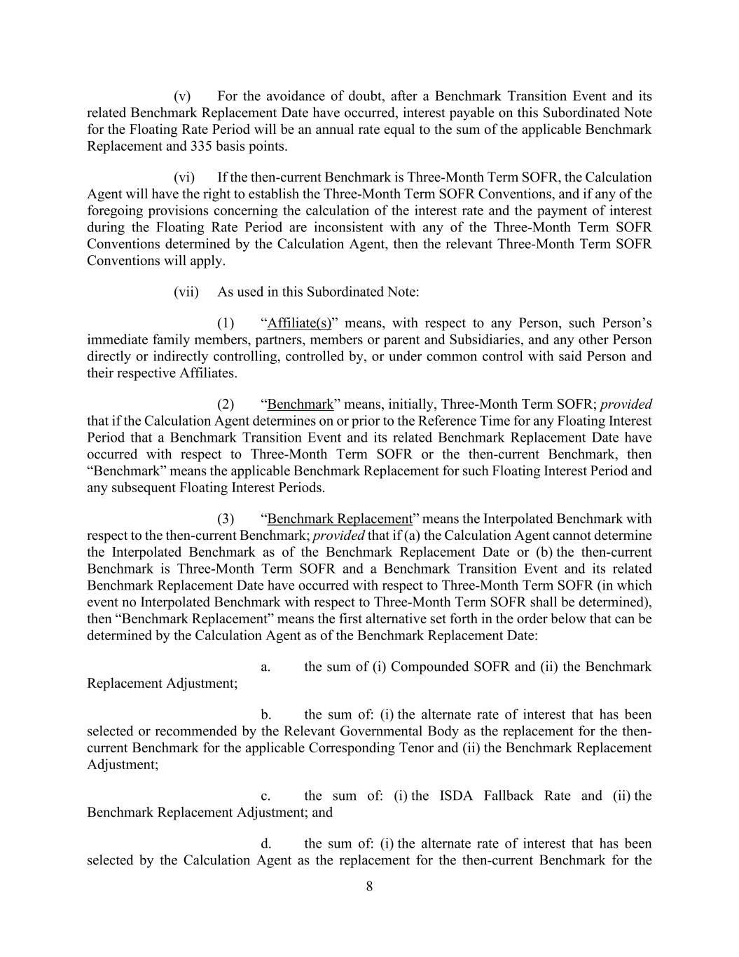 8 (v) For the avoidance of doubt, after a Benchmark Transition Event and its related Benchmark Replacement Date have occurred, interest payable on this Subordinated Note for the Floating Rate Period will be an annual rate equal to the sum of the applicable Benchmark Replacement and 335 basis points. (vi) If the then-current Benchmark is Three-Month Term SOFR, the Calculation Agent will have the right to establish the Three-Month Term SOFR Conventions, and if any of the foregoing provisions concerning the calculation of the interest rate and the payment of interest during the Floating Rate Period are inconsistent with any of the Three-Month Term SOFR Conventions determined by the Calculation Agent, then the relevant Three-Month Term SOFR Conventions will apply. (vii) As used in this Subordinated Note: (1) “Affiliate(s)” means, with respect to any Person, such Person’s immediate family members, partners, members or parent and Subsidiaries, and any other Person directly or indirectly controlling, controlled by, or under common control with said Person and their respective Affiliates. (2) “Benchmark” means, initially, Three-Month Term SOFR; provided that if the Calculation Agent determines on or prior to the Reference Time for any Floating Interest Period that a Benchmark Transition Event and its related Benchmark Replacement Date have occurred with respect to Three-Month Term SOFR or the then-current Benchmark, then “Benchmark” means the applicable Benchmark Replacement for such Floating Interest Period and any subsequent Floating Interest Periods. (3) “Benchmark Replacement” means the Interpolated Benchmark with respect to the then-current Benchmark; provided that if (a) the Calculation Agent cannot determine the Interpolated Benchmark as of the Benchmark Replacement Date or (b) the then-current Benchmark is Three-Month Term SOFR and a Benchmark Transition Event and its related Benchmark Replacement Date have occurred with respect to Three-Month Term SOFR (in which event no Interpolated Benchmark with respect to Three-Month Term SOFR shall be determined), then “Benchmark Replacement” means the first alternative set forth in the order below that can be determined by the Calculation Agent as of the Benchmark Replacement Date: a. the sum of (i) Compounded SOFR and (ii) the Benchmark Replacement Adjustment; b. the sum of: (i) the alternate rate of interest that has been selected or recommended by the Relevant Governmental Body as the replacement for the then- current Benchmark for the applicable Corresponding Tenor and (ii) the Benchmark Replacement Adjustment; c. the sum of: (i) the ISDA Fallback Rate and (ii) the Benchmark Replacement Adjustment; and d. the sum of: (i) the alternate rate of interest that has been selected by the Calculation Agent as the replacement for the then-current Benchmark for the