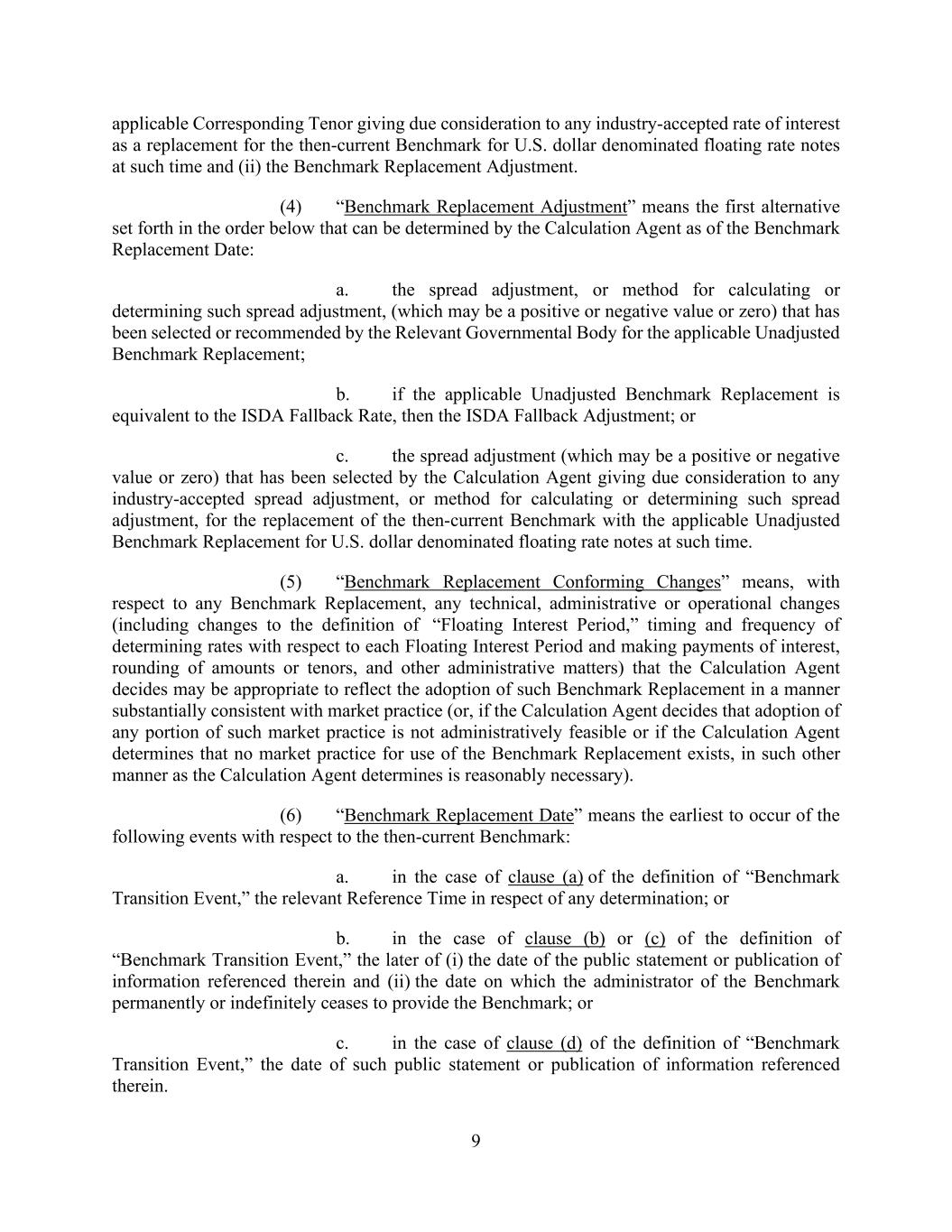 9 applicable Corresponding Tenor giving due consideration to any industry-accepted rate of interest as a replacement for the then-current Benchmark for U.S. dollar denominated floating rate notes at such time and (ii) the Benchmark Replacement Adjustment. (4) “Benchmark Replacement Adjustment” means the first alternative set forth in the order below that can be determined by the Calculation Agent as of the Benchmark Replacement Date: a. the spread adjustment, or method for calculating or determining such spread adjustment, (which may be a positive or negative value or zero) that has been selected or recommended by the Relevant Governmental Body for the applicable Unadjusted Benchmark Replacement; b. if the applicable Unadjusted Benchmark Replacement is equivalent to the ISDA Fallback Rate, then the ISDA Fallback Adjustment; or c. the spread adjustment (which may be a positive or negative value or zero) that has been selected by the Calculation Agent giving due consideration to any industry-accepted spread adjustment, or method for calculating or determining such spread adjustment, for the replacement of the then-current Benchmark with the applicable Unadjusted Benchmark Replacement for U.S. dollar denominated floating rate notes at such time. (5) “Benchmark Replacement Conforming Changes” means, with respect to any Benchmark Replacement, any technical, administrative or operational changes (including changes to the definition of “Floating Interest Period,” timing and frequency of determining rates with respect to each Floating Interest Period and making payments of interest, rounding of amounts or tenors, and other administrative matters) that the Calculation Agent decides may be appropriate to reflect the adoption of such Benchmark Replacement in a manner substantially consistent with market practice (or, if the Calculation Agent decides that adoption of any portion of such market practice is not administratively feasible or if the Calculation Agent determines that no market practice for use of the Benchmark Replacement exists, in such other manner as the Calculation Agent determines is reasonably necessary). (6) “Benchmark Replacement Date” means the earliest to occur of the following events with respect to the then-current Benchmark: a. in the case of clause (a) of the definition of “Benchmark Transition Event,” the relevant Reference Time in respect of any determination; or b. in the case of clause (b) or (c) of the definition of “Benchmark Transition Event,” the later of (i) the date of the public statement or publication of information referenced therein and (ii) the date on which the administrator of the Benchmark permanently or indefinitely ceases to provide the Benchmark; or c. in the case of clause (d) of the definition of “Benchmark Transition Event,” the date of such public statement or publication of information referenced therein.