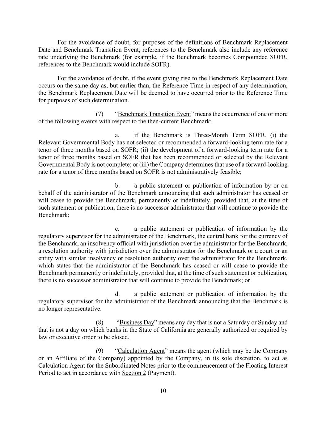 10 For the avoidance of doubt, for purposes of the definitions of Benchmark Replacement Date and Benchmark Transition Event, references to the Benchmark also include any reference rate underlying the Benchmark (for example, if the Benchmark becomes Compounded SOFR, references to the Benchmark would include SOFR). For the avoidance of doubt, if the event giving rise to the Benchmark Replacement Date occurs on the same day as, but earlier than, the Reference Time in respect of any determination, the Benchmark Replacement Date will be deemed to have occurred prior to the Reference Time for purposes of such determination. (7) “Benchmark Transition Event” means the occurrence of one or more of the following events with respect to the then-current Benchmark: a. if the Benchmark is Three-Month Term SOFR, (i) the Relevant Governmental Body has not selected or recommended a forward-looking term rate for a tenor of three months based on SOFR; (ii) the development of a forward-looking term rate for a tenor of three months based on SOFR that has been recommended or selected by the Relevant Governmental Body is not complete; or (iii) the Company determines that use of a forward-looking rate for a tenor of three months based on SOFR is not administratively feasible; b. a public statement or publication of information by or on behalf of the administrator of the Benchmark announcing that such administrator has ceased or will cease to provide the Benchmark, permanently or indefinitely, provided that, at the time of such statement or publication, there is no successor administrator that will continue to provide the Benchmark; c. a public statement or publication of information by the regulatory supervisor for the administrator of the Benchmark, the central bank for the currency of the Benchmark, an insolvency official with jurisdiction over the administrator for the Benchmark, a resolution authority with jurisdiction over the administrator for the Benchmark or a court or an entity with similar insolvency or resolution authority over the administrator for the Benchmark, which states that the administrator of the Benchmark has ceased or will cease to provide the Benchmark permanently or indefinitely, provided that, at the time of such statement or publication, there is no successor administrator that will continue to provide the Benchmark; or d. a public statement or publication of information by the regulatory supervisor for the administrator of the Benchmark announcing that the Benchmark is no longer representative. (8) “Business Day” means any day that is not a Saturday or Sunday and that is not a day on which banks in the State of California are generally authorized or required by law or executive order to be closed. (9) “Calculation Agent” means the agent (which may be the Company or an Affiliate of the Company) appointed by the Company, in its sole discretion, to act as Calculation Agent for the Subordinated Notes prior to the commencement of the Floating Interest Period to act in accordance with Section 2 (Payment).