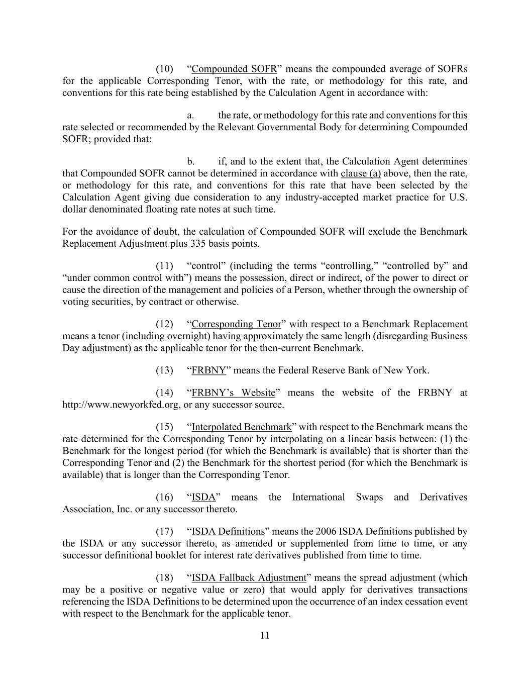 11 (10) “Compounded SOFR” means the compounded average of SOFRs for the applicable Corresponding Tenor, with the rate, or methodology for this rate, and conventions for this rate being established by the Calculation Agent in accordance with: a. the rate, or methodology for this rate and conventions for this rate selected or recommended by the Relevant Governmental Body for determining Compounded SOFR; provided that: b. if, and to the extent that, the Calculation Agent determines that Compounded SOFR cannot be determined in accordance with clause (a) above, then the rate, or methodology for this rate, and conventions for this rate that have been selected by the Calculation Agent giving due consideration to any industry-accepted market practice for U.S. dollar denominated floating rate notes at such time. For the avoidance of doubt, the calculation of Compounded SOFR will exclude the Benchmark Replacement Adjustment plus 335 basis points. (11) “control” (including the terms “controlling,” “controlled by” and “under common control with”) means the possession, direct or indirect, of the power to direct or cause the direction of the management and policies of a Person, whether through the ownership of voting securities, by contract or otherwise. (12) “Corresponding Tenor” with respect to a Benchmark Replacement means a tenor (including overnight) having approximately the same length (disregarding Business Day adjustment) as the applicable tenor for the then-current Benchmark. (13) “FRBNY” means the Federal Reserve Bank of New York. (14) “FRBNY’s Website” means the website of the FRBNY at http://www.newyorkfed.org, or any successor source. (15) “Interpolated Benchmark” with respect to the Benchmark means the rate determined for the Corresponding Tenor by interpolating on a linear basis between: (1) the Benchmark for the longest period (for which the Benchmark is available) that is shorter than the Corresponding Tenor and (2) the Benchmark for the shortest period (for which the Benchmark is available) that is longer than the Corresponding Tenor. (16) “ISDA” means the International Swaps and Derivatives Association, Inc. or any successor thereto. (17) “ISDA Definitions” means the 2006 ISDA Definitions published by the ISDA or any successor thereto, as amended or supplemented from time to time, or any successor definitional booklet for interest rate derivatives published from time to time. (18) “ISDA Fallback Adjustment” means the spread adjustment (which may be a positive or negative value or zero) that would apply for derivatives transactions referencing the ISDA Definitions to be determined upon the occurrence of an index cessation event with respect to the Benchmark for the applicable tenor.