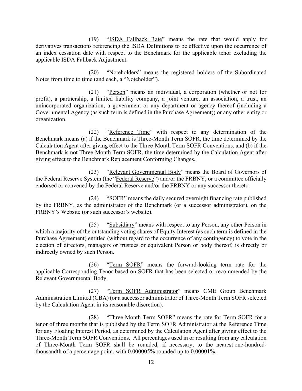 12 (19) “ISDA Fallback Rate” means the rate that would apply for derivatives transactions referencing the ISDA Definitions to be effective upon the occurrence of an index cessation date with respect to the Benchmark for the applicable tenor excluding the applicable ISDA Fallback Adjustment. (20) “Noteholders” means the registered holders of the Subordinated Notes from time to time (and each, a “Noteholder”). (21) “Person” means an individual, a corporation (whether or not for profit), a partnership, a limited liability company, a joint venture, an association, a trust, an unincorporated organization, a government or any department or agency thereof (including a Governmental Agency (as such term is defined in the Purchase Agreement)) or any other entity or organization. (22) “Reference Time” with respect to any determination of the Benchmark means (a) if the Benchmark is Three-Month Term SOFR, the time determined by the Calculation Agent after giving effect to the Three-Month Term SOFR Conventions, and (b) if the Benchmark is not Three-Month Term SOFR, the time determined by the Calculation Agent after giving effect to the Benchmark Replacement Conforming Changes. (23) “Relevant Governmental Body” means the Board of Governors of the Federal Reserve System (the “Federal Reserve”) and/or the FRBNY, or a committee officially endorsed or convened by the Federal Reserve and/or the FRBNY or any successor thereto. (24) “SOFR” means the daily secured overnight financing rate published by the FRBNY, as the administrator of the Benchmark (or a successor administrator), on the FRBNY’s Website (or such successor’s website). (25) “Subsidiary” means with respect to any Person, any other Person in which a majority of the outstanding voting shares of Equity Interest (as such term is defined in the Purchase Agreement) entitled (without regard to the occurrence of any contingency) to vote in the election of directors, managers or trustees or equivalent Person or body thereof, is directly or indirectly owned by such Person. (26) “Term SOFR” means the forward-looking term rate for the applicable Corresponding Tenor based on SOFR that has been selected or recommended by the Relevant Governmental Body. (27) “Term SOFR Administrator” means CME Group Benchmark Administration Limited (CBA) (or a successor administrator of Three-Month Term SOFR selected by the Calculation Agent in its reasonable discretion). (28) “Three-Month Term SOFR” means the rate for Term SOFR for a tenor of three months that is published by the Term SOFR Administrator at the Reference Time for any Floating Interest Period, as determined by the Calculation Agent after giving effect to the Three-Month Term SOFR Conventions. All percentages used in or resulting from any calculation of Three-Month Term SOFR shall be rounded, if necessary, to the nearest one-hundred- thousandth of a percentage point, with 0.000005% rounded up to 0.00001%.