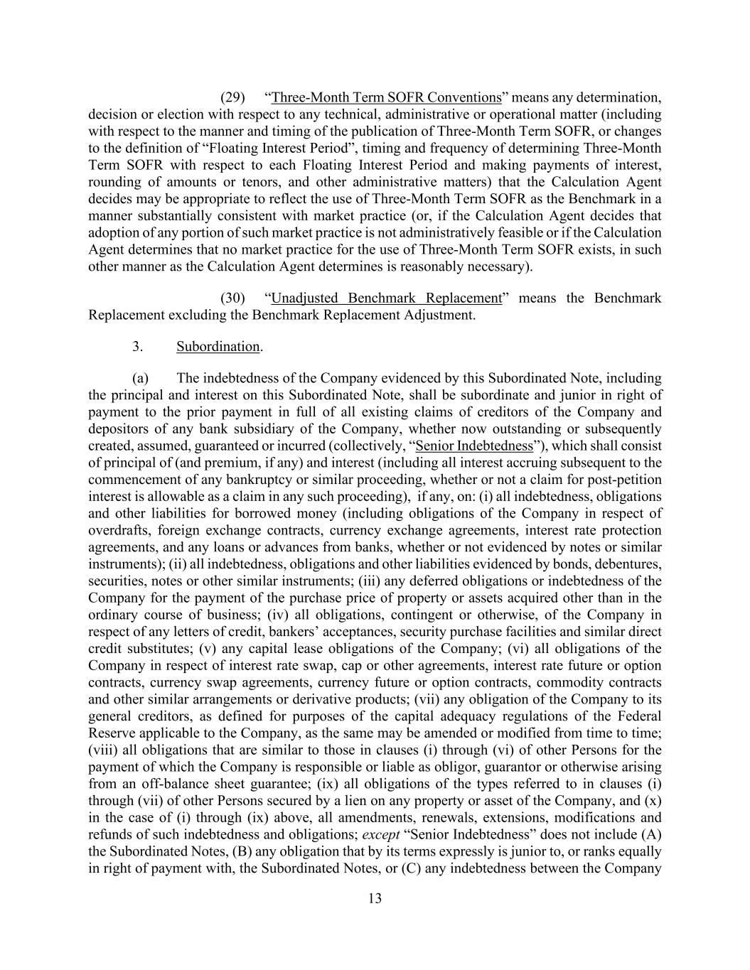13 (29) “Three-Month Term SOFR Conventions” means any determination, decision or election with respect to any technical, administrative or operational matter (including with respect to the manner and timing of the publication of Three-Month Term SOFR, or changes to the definition of “Floating Interest Period”, timing and frequency of determining Three-Month Term SOFR with respect to each Floating Interest Period and making payments of interest, rounding of amounts or tenors, and other administrative matters) that the Calculation Agent decides may be appropriate to reflect the use of Three-Month Term SOFR as the Benchmark in a manner substantially consistent with market practice (or, if the Calculation Agent decides that adoption of any portion of such market practice is not administratively feasible or if the Calculation Agent determines that no market practice for the use of Three-Month Term SOFR exists, in such other manner as the Calculation Agent determines is reasonably necessary). (30) “Unadjusted Benchmark Replacement” means the Benchmark Replacement excluding the Benchmark Replacement Adjustment. 3. Subordination. (a) The indebtedness of the Company evidenced by this Subordinated Note, including the principal and interest on this Subordinated Note, shall be subordinate and junior in right of payment to the prior payment in full of all existing claims of creditors of the Company and depositors of any bank subsidiary of the Company, whether now outstanding or subsequently created, assumed, guaranteed or incurred (collectively, “Senior Indebtedness”), which shall consist of principal of (and premium, if any) and interest (including all interest accruing subsequent to the commencement of any bankruptcy or similar proceeding, whether or not a claim for post-petition interest is allowable as a claim in any such proceeding), if any, on: (i) all indebtedness, obligations and other liabilities for borrowed money (including obligations of the Company in respect of overdrafts, foreign exchange contracts, currency exchange agreements, interest rate protection agreements, and any loans or advances from banks, whether or not evidenced by notes or similar instruments); (ii) all indebtedness, obligations and other liabilities evidenced by bonds, debentures, securities, notes or other similar instruments; (iii) any deferred obligations or indebtedness of the Company for the payment of the purchase price of property or assets acquired other than in the ordinary course of business; (iv) all obligations, contingent or otherwise, of the Company in respect of any letters of credit, bankers’ acceptances, security purchase facilities and similar direct credit substitutes; (v) any capital lease obligations of the Company; (vi) all obligations of the Company in respect of interest rate swap, cap or other agreements, interest rate future or option contracts, currency swap agreements, currency future or option contracts, commodity contracts and other similar arrangements or derivative products; (vii) any obligation of the Company to its general creditors, as defined for purposes of the capital adequacy regulations of the Federal Reserve applicable to the Company, as the same may be amended or modified from time to time; (viii) all obligations that are similar to those in clauses (i) through (vi) of other Persons for the payment of which the Company is responsible or liable as obligor, guarantor or otherwise arising from an off-balance sheet guarantee; (ix) all obligations of the types referred to in clauses (i) through (vii) of other Persons secured by a lien on any property or asset of the Company, and (x) in the case of (i) through (ix) above, all amendments, renewals, extensions, modifications and refunds of such indebtedness and obligations; except “Senior Indebtedness” does not include (A) the Subordinated Notes, (B) any obligation that by its terms expressly is junior to, or ranks equally in right of payment with, the Subordinated Notes, or (C) any indebtedness between the Company