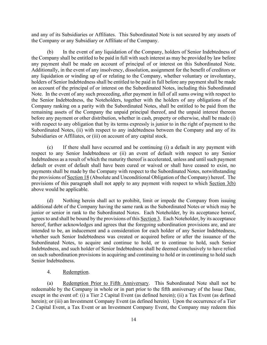 14 and any of its Subsidiaries or Affiliates. This Subordinated Note is not secured by any assets of the Company or any Subsidiary or Affiliate of the Company. (b) In the event of any liquidation of the Company, holders of Senior Indebtedness of the Company shall be entitled to be paid in full with such interest as may be provided by law before any payment shall be made on account of principal of or interest on this Subordinated Note. Additionally, in the event of any insolvency, dissolution, assignment for the benefit of creditors or any liquidation or winding up of or relating to the Company, whether voluntary or involuntary, holders of Senior Indebtedness shall be entitled to be paid in full before any payment shall be made on account of the principal of or interest on the Subordinated Notes, including this Subordinated Note. In the event of any such proceeding, after payment in full of all sums owing with respect to the Senior Indebtedness, the Noteholders, together with the holders of any obligations of the Company ranking on a parity with the Subordinated Notes, shall be entitled to be paid from the remaining assets of the Company the unpaid principal thereof, and the unpaid interest thereon before any payment or other distribution, whether in cash, property or otherwise, shall be made (i) with respect to any obligation that by its terms expressly is junior to in the right of payment to the Subordinated Notes, (ii) with respect to any indebtedness between the Company and any of its Subsidiaries or Affiliates, or (iii) on account of any capital stock. (c) If there shall have occurred and be continuing (i) a default in any payment with respect to any Senior Indebtedness or (ii) an event of default with respect to any Senior Indebtedness as a result of which the maturity thereof is accelerated, unless and until such payment default or event of default shall have been cured or waived or shall have ceased to exist, no payments shall be made by the Company with respect to the Subordinated Notes, notwithstanding the provisions of Section 18 (Absolute and Unconditional Obligation of the Company) hereof. The provisions of this paragraph shall not apply to any payment with respect to which Section 3(b) above would be applicable. (d) Nothing herein shall act to prohibit, limit or impede the Company from issuing additional debt of the Company having the same rank as the Subordinated Notes or which may be junior or senior in rank to the Subordinated Notes. Each Noteholder, by its acceptance hereof, agrees to and shall be bound by the provisions of this Section 3. Each Noteholder, by its acceptance hereof, further acknowledges and agrees that the foregoing subordination provisions are, and are intended to be, an inducement and a consideration for each holder of any Senior Indebtedness, whether such Senior Indebtedness was created or acquired before or after the issuance of the Subordinated Notes, to acquire and continue to hold, or to continue to hold, such Senior Indebtedness, and such holder of Senior Indebtedness shall be deemed conclusively to have relied on such subordination provisions in acquiring and continuing to hold or in continuing to hold such Senior Indebtedness. 4. Redemption. (a) Redemption Prior to Fifth Anniversary. This Subordinated Note shall not be redeemable by the Company in whole or in part prior to the fifth anniversary of the Issue Date, except in the event of: (i) a Tier 2 Capital Event (as defined herein); (ii) a Tax Event (as defined herein); or (iii) an Investment Company Event (as defined herein). Upon the occurrence of a Tier 2 Capital Event, a Tax Event or an Investment Company Event, the Company may redeem this