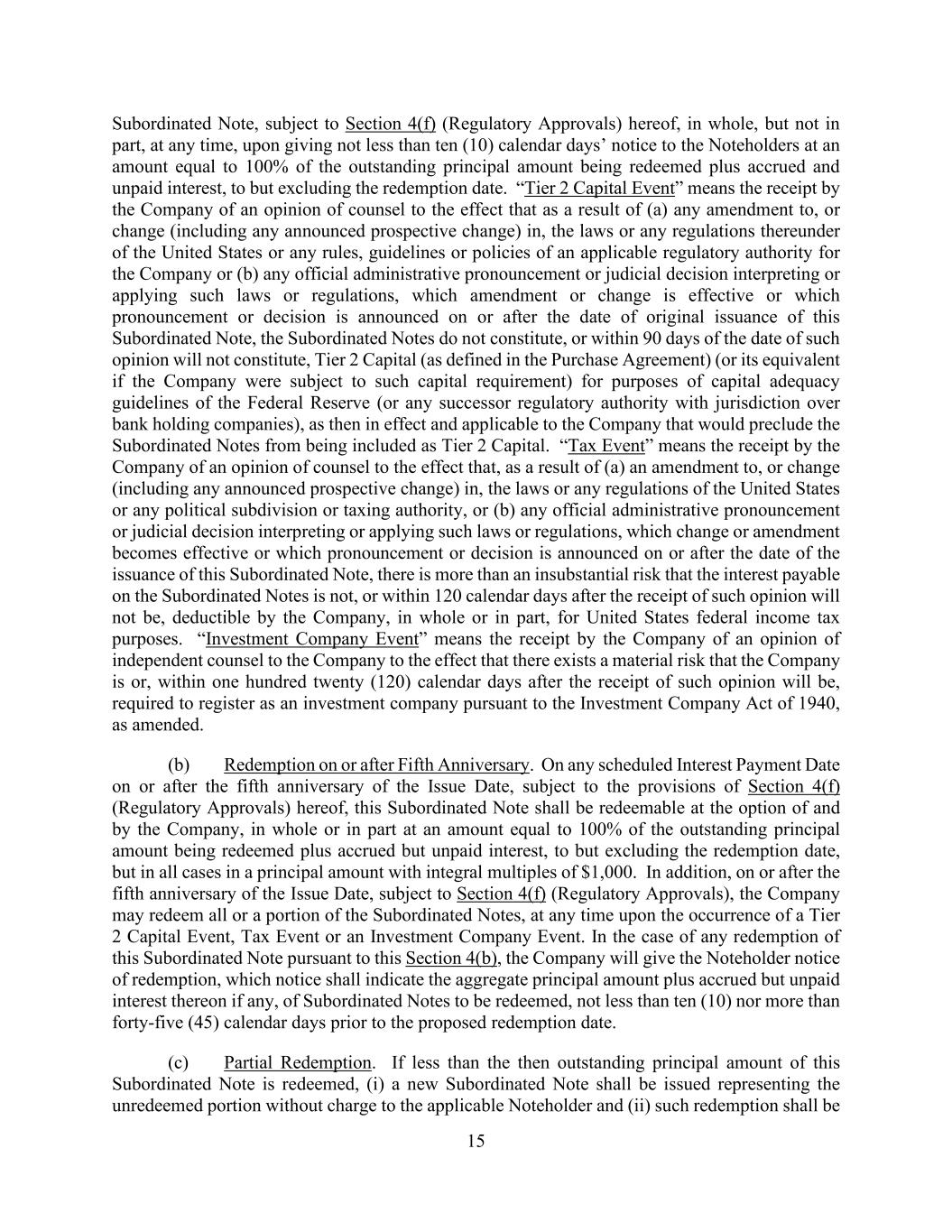 15 Subordinated Note, subject to Section 4(f) (Regulatory Approvals) hereof, in whole, but not in part, at any time, upon giving not less than ten (10) calendar days’ notice to the Noteholders at an amount equal to 100% of the outstanding principal amount being redeemed plus accrued and unpaid interest, to but excluding the redemption date. “Tier 2 Capital Event” means the receipt by the Company of an opinion of counsel to the effect that as a result of (a) any amendment to, or change (including any announced prospective change) in, the laws or any regulations thereunder of the United States or any rules, guidelines or policies of an applicable regulatory authority for the Company or (b) any official administrative pronouncement or judicial decision interpreting or applying such laws or regulations, which amendment or change is effective or which pronouncement or decision is announced on or after the date of original issuance of this Subordinated Note, the Subordinated Notes do not constitute, or within 90 days of the date of such opinion will not constitute, Tier 2 Capital (as defined in the Purchase Agreement) (or its equivalent if the Company were subject to such capital requirement) for purposes of capital adequacy guidelines of the Federal Reserve (or any successor regulatory authority with jurisdiction over bank holding companies), as then in effect and applicable to the Company that would preclude the Subordinated Notes from being included as Tier 2 Capital. “Tax Event” means the receipt by the Company of an opinion of counsel to the effect that, as a result of (a) an amendment to, or change (including any announced prospective change) in, the laws or any regulations of the United States or any political subdivision or taxing authority, or (b) any official administrative pronouncement or judicial decision interpreting or applying such laws or regulations, which change or amendment becomes effective or which pronouncement or decision is announced on or after the date of the issuance of this Subordinated Note, there is more than an insubstantial risk that the interest payable on the Subordinated Notes is not, or within 120 calendar days after the receipt of such opinion will not be, deductible by the Company, in whole or in part, for United States federal income tax purposes. “Investment Company Event” means the receipt by the Company of an opinion of independent counsel to the Company to the effect that there exists a material risk that the Company is or, within one hundred twenty (120) calendar days after the receipt of such opinion will be, required to register as an investment company pursuant to the Investment Company Act of 1940, as amended. (b) Redemption on or after Fifth Anniversary. On any scheduled Interest Payment Date on or after the fifth anniversary of the Issue Date, subject to the provisions of Section 4(f) (Regulatory Approvals) hereof, this Subordinated Note shall be redeemable at the option of and by the Company, in whole or in part at an amount equal to 100% of the outstanding principal amount being redeemed plus accrued but unpaid interest, to but excluding the redemption date, but in all cases in a principal amount with integral multiples of $1,000. In addition, on or after the fifth anniversary of the Issue Date, subject to Section 4(f) (Regulatory Approvals), the Company may redeem all or a portion of the Subordinated Notes, at any time upon the occurrence of a Tier 2 Capital Event, Tax Event or an Investment Company Event. In the case of any redemption of this Subordinated Note pursuant to this Section 4(b), the Company will give the Noteholder notice of redemption, which notice shall indicate the aggregate principal amount plus accrued but unpaid interest thereon if any, of Subordinated Notes to be redeemed, not less than ten (10) nor more than forty-five (45) calendar days prior to the proposed redemption date. (c) Partial Redemption. If less than the then outstanding principal amount of this Subordinated Note is redeemed, (i) a new Subordinated Note shall be issued representing the unredeemed portion without charge to the applicable Noteholder and (ii) such redemption shall be