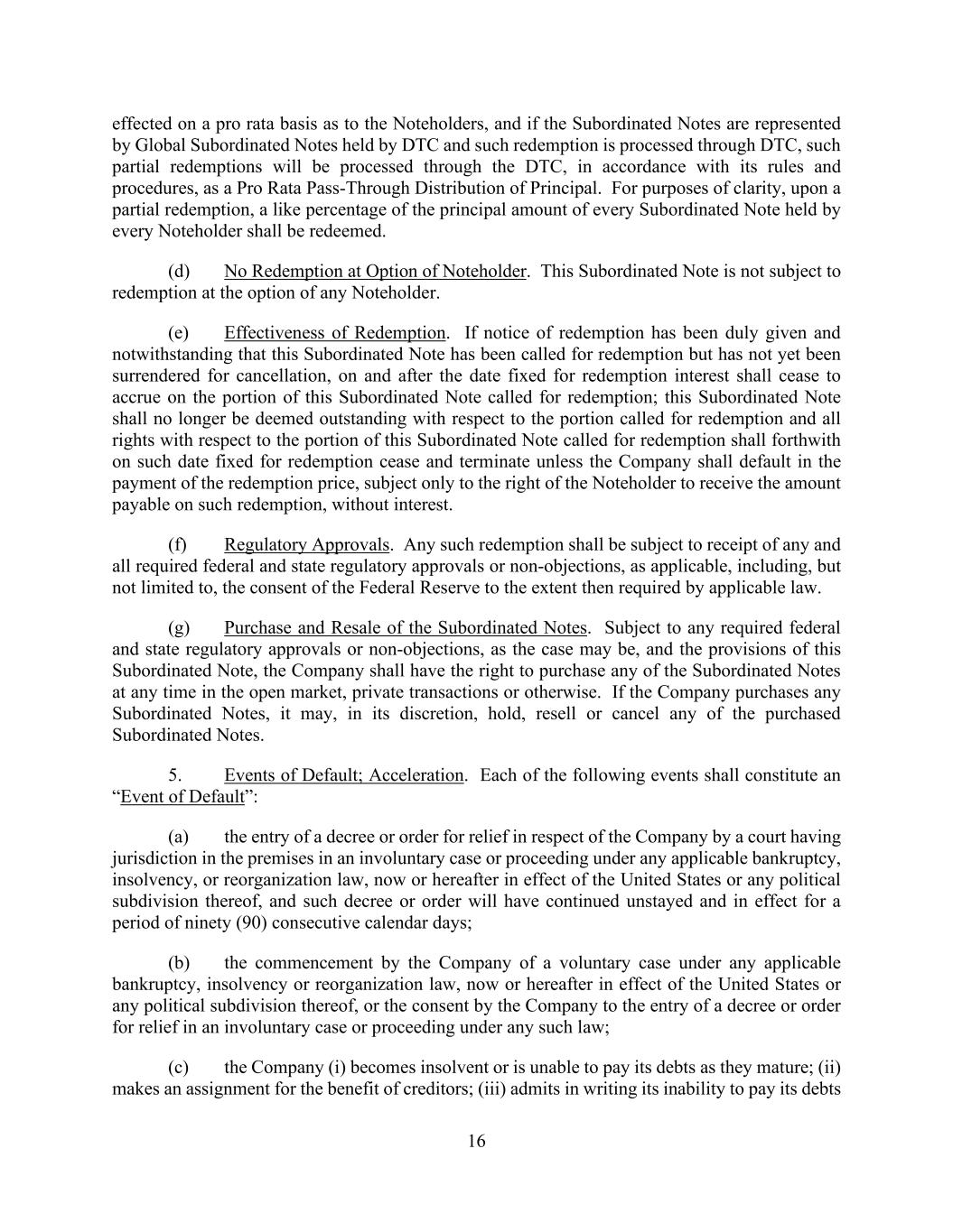 16 effected on a pro rata basis as to the Noteholders, and if the Subordinated Notes are represented by Global Subordinated Notes held by DTC and such redemption is processed through DTC, such partial redemptions will be processed through the DTC, in accordance with its rules and procedures, as a Pro Rata Pass-Through Distribution of Principal. For purposes of clarity, upon a partial redemption, a like percentage of the principal amount of every Subordinated Note held by every Noteholder shall be redeemed. (d) No Redemption at Option of Noteholder. This Subordinated Note is not subject to redemption at the option of any Noteholder. (e) Effectiveness of Redemption. If notice of redemption has been duly given and notwithstanding that this Subordinated Note has been called for redemption but has not yet been surrendered for cancellation, on and after the date fixed for redemption interest shall cease to accrue on the portion of this Subordinated Note called for redemption; this Subordinated Note shall no longer be deemed outstanding with respect to the portion called for redemption and all rights with respect to the portion of this Subordinated Note called for redemption shall forthwith on such date fixed for redemption cease and terminate unless the Company shall default in the payment of the redemption price, subject only to the right of the Noteholder to receive the amount payable on such redemption, without interest. (f) Regulatory Approvals. Any such redemption shall be subject to receipt of any and all required federal and state regulatory approvals or non-objections, as applicable, including, but not limited to, the consent of the Federal Reserve to the extent then required by applicable law. (g) Purchase and Resale of the Subordinated Notes. Subject to any required federal and state regulatory approvals or non-objections, as the case may be, and the provisions of this Subordinated Note, the Company shall have the right to purchase any of the Subordinated Notes at any time in the open market, private transactions or otherwise. If the Company purchases any Subordinated Notes, it may, in its discretion, hold, resell or cancel any of the purchased Subordinated Notes. 5. Events of Default; Acceleration. Each of the following events shall constitute an “Event of Default”: (a) the entry of a decree or order for relief in respect of the Company by a court having jurisdiction in the premises in an involuntary case or proceeding under any applicable bankruptcy, insolvency, or reorganization law, now or hereafter in effect of the United States or any political subdivision thereof, and such decree or order will have continued unstayed and in effect for a period of ninety (90) consecutive calendar days; (b) the commencement by the Company of a voluntary case under any applicable bankruptcy, insolvency or reorganization law, now or hereafter in effect of the United States or any political subdivision thereof, or the consent by the Company to the entry of a decree or order for relief in an involuntary case or proceeding under any such law; (c) the Company (i) becomes insolvent or is unable to pay its debts as they mature; (ii) makes an assignment for the benefit of creditors; (iii) admits in writing its inability to pay its debts