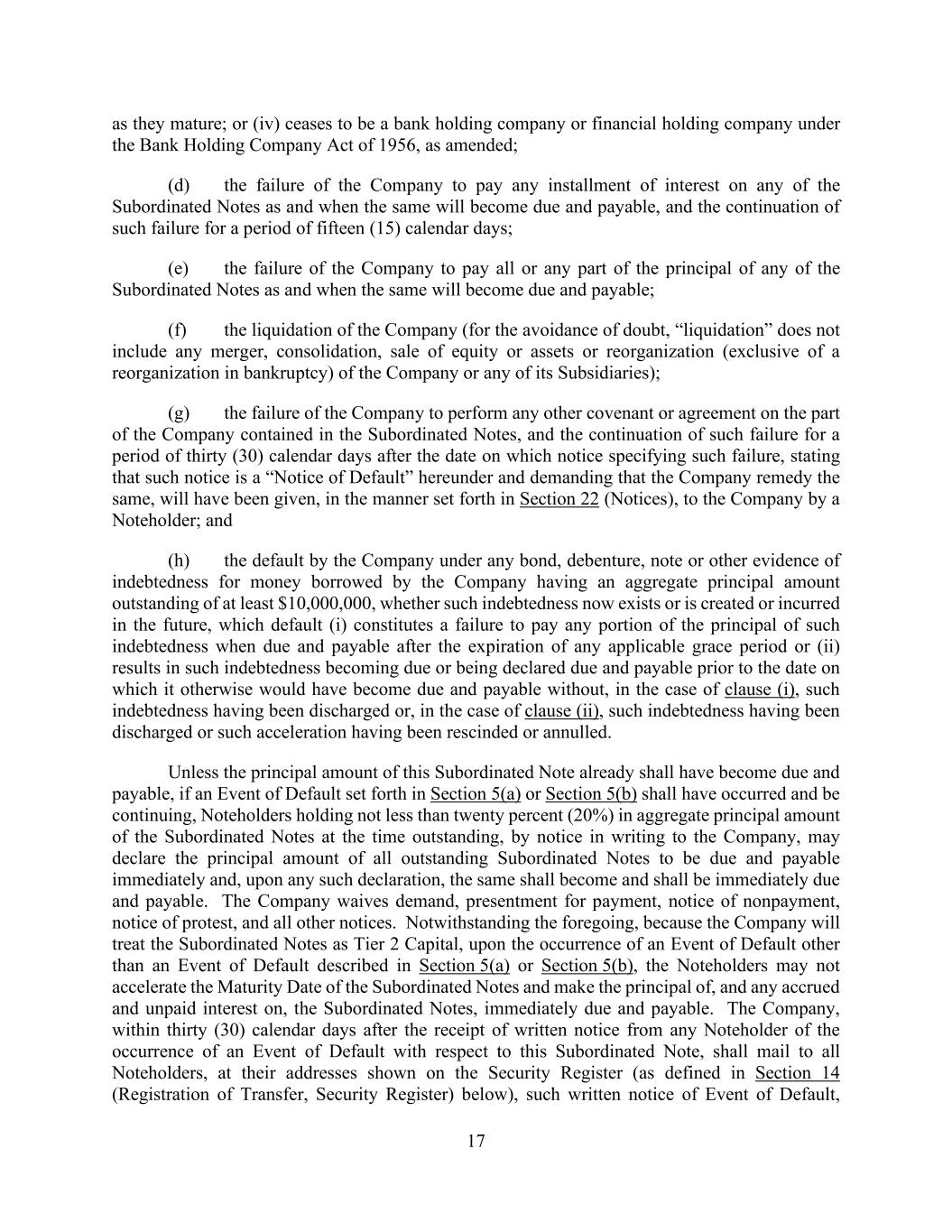17 as they mature; or (iv) ceases to be a bank holding company or financial holding company under the Bank Holding Company Act of 1956, as amended; (d) the failure of the Company to pay any installment of interest on any of the Subordinated Notes as and when the same will become due and payable, and the continuation of such failure for a period of fifteen (15) calendar days; (e) the failure of the Company to pay all or any part of the principal of any of the Subordinated Notes as and when the same will become due and payable; (f) the liquidation of the Company (for the avoidance of doubt, “liquidation” does not include any merger, consolidation, sale of equity or assets or reorganization (exclusive of a reorganization in bankruptcy) of the Company or any of its Subsidiaries); (g) the failure of the Company to perform any other covenant or agreement on the part of the Company contained in the Subordinated Notes, and the continuation of such failure for a period of thirty (30) calendar days after the date on which notice specifying such failure, stating that such notice is a “Notice of Default” hereunder and demanding that the Company remedy the same, will have been given, in the manner set forth in Section 22 (Notices), to the Company by a Noteholder; and (h) the default by the Company under any bond, debenture, note or other evidence of indebtedness for money borrowed by the Company having an aggregate principal amount outstanding of at least $10,000,000, whether such indebtedness now exists or is created or incurred in the future, which default (i) constitutes a failure to pay any portion of the principal of such indebtedness when due and payable after the expiration of any applicable grace period or (ii) results in such indebtedness becoming due or being declared due and payable prior to the date on which it otherwise would have become due and payable without, in the case of clause (i), such indebtedness having been discharged or, in the case of clause (ii), such indebtedness having been discharged or such acceleration having been rescinded or annulled. Unless the principal amount of this Subordinated Note already shall have become due and payable, if an Event of Default set forth in Section 5(a) or Section 5(b) shall have occurred and be continuing, Noteholders holding not less than twenty percent (20%) in aggregate principal amount of the Subordinated Notes at the time outstanding, by notice in writing to the Company, may declare the principal amount of all outstanding Subordinated Notes to be due and payable immediately and, upon any such declaration, the same shall become and shall be immediately due and payable. The Company waives demand, presentment for payment, notice of nonpayment, notice of protest, and all other notices. Notwithstanding the foregoing, because the Company will treat the Subordinated Notes as Tier 2 Capital, upon the occurrence of an Event of Default other than an Event of Default described in Section 5(a) or Section 5(b), the Noteholders may not accelerate the Maturity Date of the Subordinated Notes and make the principal of, and any accrued and unpaid interest on, the Subordinated Notes, immediately due and payable. The Company, within thirty (30) calendar days after the receipt of written notice from any Noteholder of the occurrence of an Event of Default with respect to this Subordinated Note, shall mail to all Noteholders, at their addresses shown on the Security Register (as defined in Section 14 (Registration of Transfer, Security Register) below), such written notice of Event of Default,