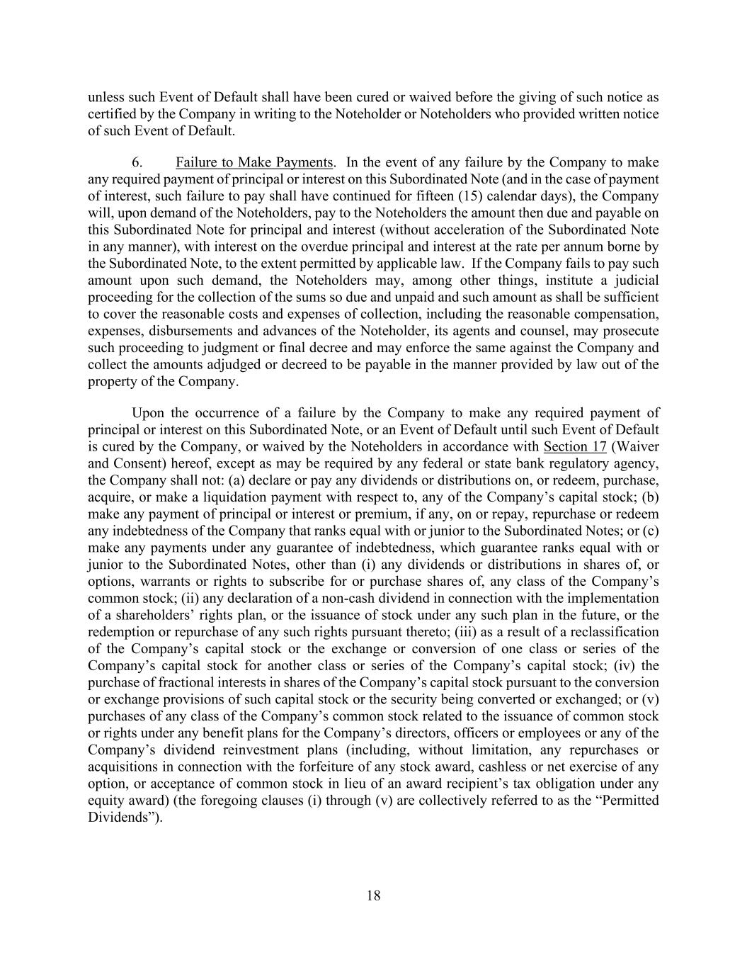 18 unless such Event of Default shall have been cured or waived before the giving of such notice as certified by the Company in writing to the Noteholder or Noteholders who provided written notice of such Event of Default. 6. Failure to Make Payments. In the event of any failure by the Company to make any required payment of principal or interest on this Subordinated Note (and in the case of payment of interest, such failure to pay shall have continued for fifteen (15) calendar days), the Company will, upon demand of the Noteholders, pay to the Noteholders the amount then due and payable on this Subordinated Note for principal and interest (without acceleration of the Subordinated Note in any manner), with interest on the overdue principal and interest at the rate per annum borne by the Subordinated Note, to the extent permitted by applicable law. If the Company fails to pay such amount upon such demand, the Noteholders may, among other things, institute a judicial proceeding for the collection of the sums so due and unpaid and such amount as shall be sufficient to cover the reasonable costs and expenses of collection, including the reasonable compensation, expenses, disbursements and advances of the Noteholder, its agents and counsel, may prosecute such proceeding to judgment or final decree and may enforce the same against the Company and collect the amounts adjudged or decreed to be payable in the manner provided by law out of the property of the Company. Upon the occurrence of a failure by the Company to make any required payment of principal or interest on this Subordinated Note, or an Event of Default until such Event of Default is cured by the Company, or waived by the Noteholders in accordance with Section 17 (Waiver and Consent) hereof, except as may be required by any federal or state bank regulatory agency, the Company shall not: (a) declare or pay any dividends or distributions on, or redeem, purchase, acquire, or make a liquidation payment with respect to, any of the Company’s capital stock; (b) make any payment of principal or interest or premium, if any, on or repay, repurchase or redeem any indebtedness of the Company that ranks equal with or junior to the Subordinated Notes; or (c) make any payments under any guarantee of indebtedness, which guarantee ranks equal with or junior to the Subordinated Notes, other than (i) any dividends or distributions in shares of, or options, warrants or rights to subscribe for or purchase shares of, any class of the Company’s common stock; (ii) any declaration of a non-cash dividend in connection with the implementation of a shareholders’ rights plan, or the issuance of stock under any such plan in the future, or the redemption or repurchase of any such rights pursuant thereto; (iii) as a result of a reclassification of the Company’s capital stock or the exchange or conversion of one class or series of the Company’s capital stock for another class or series of the Company’s capital stock; (iv) the purchase of fractional interests in shares of the Company’s capital stock pursuant to the conversion or exchange provisions of such capital stock or the security being converted or exchanged; or (v) purchases of any class of the Company’s common stock related to the issuance of common stock or rights under any benefit plans for the Company’s directors, officers or employees or any of the Company’s dividend reinvestment plans (including, without limitation, any repurchases or acquisitions in connection with the forfeiture of any stock award, cashless or net exercise of any option, or acceptance of common stock in lieu of an award recipient’s tax obligation under any equity award) (the foregoing clauses (i) through (v) are collectively referred to as the “Permitted Dividends”).