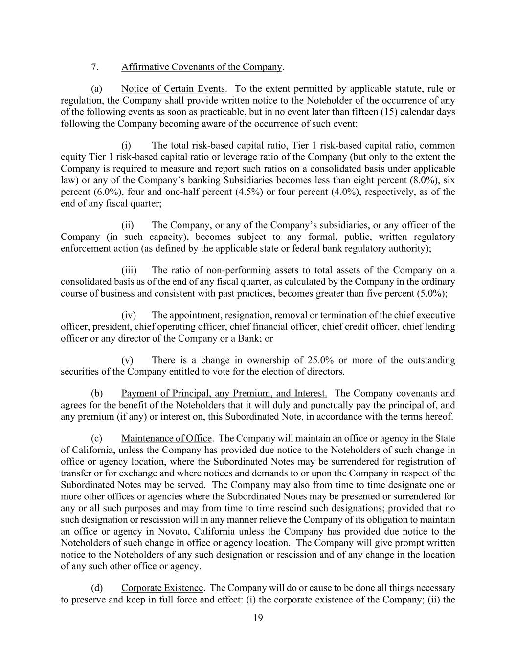 19 7. Affirmative Covenants of the Company. (a) Notice of Certain Events. To the extent permitted by applicable statute, rule or regulation, the Company shall provide written notice to the Noteholder of the occurrence of any of the following events as soon as practicable, but in no event later than fifteen (15) calendar days following the Company becoming aware of the occurrence of such event: (i) The total risk-based capital ratio, Tier 1 risk-based capital ratio, common equity Tier 1 risk-based capital ratio or leverage ratio of the Company (but only to the extent the Company is required to measure and report such ratios on a consolidated basis under applicable law) or any of the Company’s banking Subsidiaries becomes less than eight percent (8.0%), six percent (6.0%), four and one-half percent (4.5%) or four percent (4.0%), respectively, as of the end of any fiscal quarter; (ii) The Company, or any of the Company’s subsidiaries, or any officer of the Company (in such capacity), becomes subject to any formal, public, written regulatory enforcement action (as defined by the applicable state or federal bank regulatory authority); (iii) The ratio of non-performing assets to total assets of the Company on a consolidated basis as of the end of any fiscal quarter, as calculated by the Company in the ordinary course of business and consistent with past practices, becomes greater than five percent (5.0%); (iv) The appointment, resignation, removal or termination of the chief executive officer, president, chief operating officer, chief financial officer, chief credit officer, chief lending officer or any director of the Company or a Bank; or (v) There is a change in ownership of 25.0% or more of the outstanding securities of the Company entitled to vote for the election of directors. (b) Payment of Principal, any Premium, and Interest. The Company covenants and agrees for the benefit of the Noteholders that it will duly and punctually pay the principal of, and any premium (if any) or interest on, this Subordinated Note, in accordance with the terms hereof. (c) Maintenance of Office. The Company will maintain an office or agency in the State of California, unless the Company has provided due notice to the Noteholders of such change in office or agency location, where the Subordinated Notes may be surrendered for registration of transfer or for exchange and where notices and demands to or upon the Company in respect of the Subordinated Notes may be served. The Company may also from time to time designate one or more other offices or agencies where the Subordinated Notes may be presented or surrendered for any or all such purposes and may from time to time rescind such designations; provided that no such designation or rescission will in any manner relieve the Company of its obligation to maintain an office or agency in Novato, California unless the Company has provided due notice to the Noteholders of such change in office or agency location. The Company will give prompt written notice to the Noteholders of any such designation or rescission and of any change in the location of any such other office or agency. (d) Corporate Existence. The Company will do or cause to be done all things necessary to preserve and keep in full force and effect: (i) the corporate existence of the Company; (ii) the