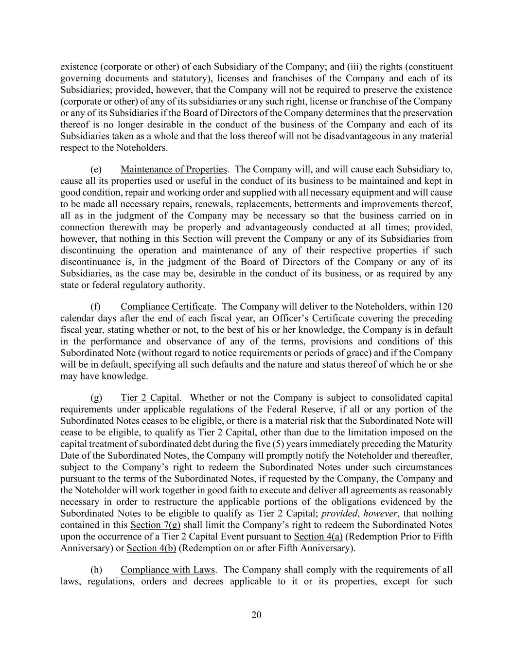 20 existence (corporate or other) of each Subsidiary of the Company; and (iii) the rights (constituent governing documents and statutory), licenses and franchises of the Company and each of its Subsidiaries; provided, however, that the Company will not be required to preserve the existence (corporate or other) of any of its subsidiaries or any such right, license or franchise of the Company or any of its Subsidiaries if the Board of Directors of the Company determines that the preservation thereof is no longer desirable in the conduct of the business of the Company and each of its Subsidiaries taken as a whole and that the loss thereof will not be disadvantageous in any material respect to the Noteholders. (e) Maintenance of Properties. The Company will, and will cause each Subsidiary to, cause all its properties used or useful in the conduct of its business to be maintained and kept in good condition, repair and working order and supplied with all necessary equipment and will cause to be made all necessary repairs, renewals, replacements, betterments and improvements thereof, all as in the judgment of the Company may be necessary so that the business carried on in connection therewith may be properly and advantageously conducted at all times; provided, however, that nothing in this Section will prevent the Company or any of its Subsidiaries from discontinuing the operation and maintenance of any of their respective properties if such discontinuance is, in the judgment of the Board of Directors of the Company or any of its Subsidiaries, as the case may be, desirable in the conduct of its business, or as required by any state or federal regulatory authority. (f) Compliance Certificate. The Company will deliver to the Noteholders, within 120 calendar days after the end of each fiscal year, an Officer’s Certificate covering the preceding fiscal year, stating whether or not, to the best of his or her knowledge, the Company is in default in the performance and observance of any of the terms, provisions and conditions of this Subordinated Note (without regard to notice requirements or periods of grace) and if the Company will be in default, specifying all such defaults and the nature and status thereof of which he or she may have knowledge. (g) Tier 2 Capital. Whether or not the Company is subject to consolidated capital requirements under applicable regulations of the Federal Reserve, if all or any portion of the Subordinated Notes ceases to be eligible, or there is a material risk that the Subordinated Note will cease to be eligible, to qualify as Tier 2 Capital, other than due to the limitation imposed on the capital treatment of subordinated debt during the five (5) years immediately preceding the Maturity Date of the Subordinated Notes, the Company will promptly notify the Noteholder and thereafter, subject to the Company’s right to redeem the Subordinated Notes under such circumstances pursuant to the terms of the Subordinated Notes, if requested by the Company, the Company and the Noteholder will work together in good faith to execute and deliver all agreements as reasonably necessary in order to restructure the applicable portions of the obligations evidenced by the Subordinated Notes to be eligible to qualify as Tier 2 Capital; provided, however, that nothing contained in this Section 7(g) shall limit the Company’s right to redeem the Subordinated Notes upon the occurrence of a Tier 2 Capital Event pursuant to Section 4(a) (Redemption Prior to Fifth Anniversary) or Section 4(b) (Redemption on or after Fifth Anniversary). (h) Compliance with Laws. The Company shall comply with the requirements of all laws, regulations, orders and decrees applicable to it or its properties, except for such