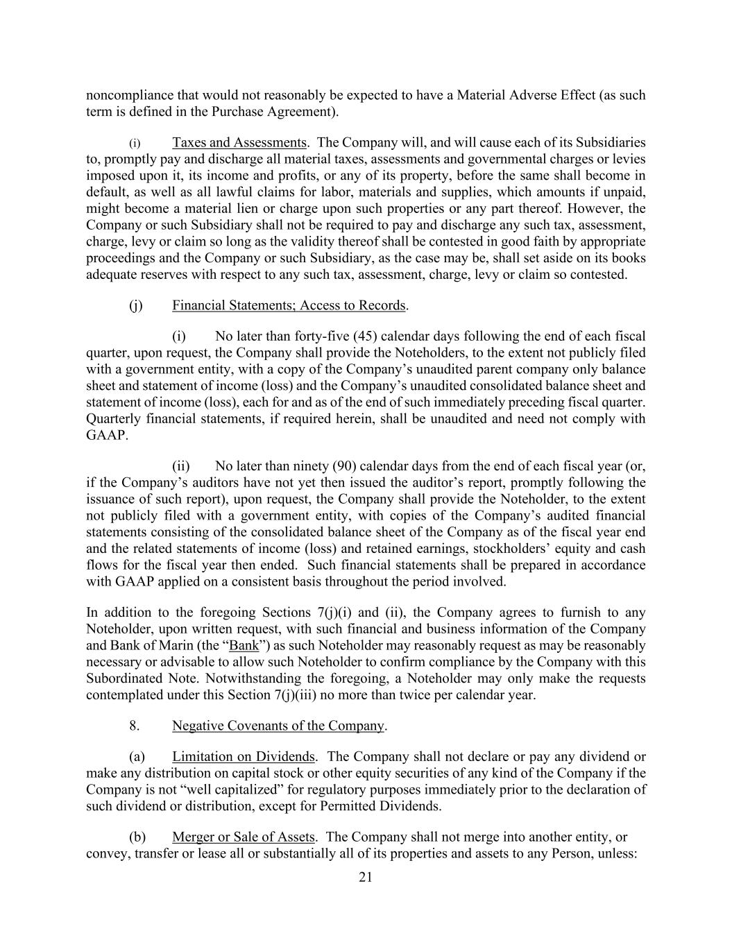 21 noncompliance that would not reasonably be expected to have a Material Adverse Effect (as such term is defined in the Purchase Agreement). (i) Taxes and Assessments. The Company will, and will cause each of its Subsidiaries to, promptly pay and discharge all material taxes, assessments and governmental charges or levies imposed upon it, its income and profits, or any of its property, before the same shall become in default, as well as all lawful claims for labor, materials and supplies, which amounts if unpaid, might become a material lien or charge upon such properties or any part thereof. However, the Company or such Subsidiary shall not be required to pay and discharge any such tax, assessment, charge, levy or claim so long as the validity thereof shall be contested in good faith by appropriate proceedings and the Company or such Subsidiary, as the case may be, shall set aside on its books adequate reserves with respect to any such tax, assessment, charge, levy or claim so contested. (j) Financial Statements; Access to Records. (i) No later than forty-five (45) calendar days following the end of each fiscal quarter, upon request, the Company shall provide the Noteholders, to the extent not publicly filed with a government entity, with a copy of the Company’s unaudited parent company only balance sheet and statement of income (loss) and the Company’s unaudited consolidated balance sheet and statement of income (loss), each for and as of the end of such immediately preceding fiscal quarter. Quarterly financial statements, if required herein, shall be unaudited and need not comply with GAAP. (ii) No later than ninety (90) calendar days from the end of each fiscal year (or, if the Company’s auditors have not yet then issued the auditor’s report, promptly following the issuance of such report), upon request, the Company shall provide the Noteholder, to the extent not publicly filed with a government entity, with copies of the Company’s audited financial statements consisting of the consolidated balance sheet of the Company as of the fiscal year end and the related statements of income (loss) and retained earnings, stockholders’ equity and cash flows for the fiscal year then ended. Such financial statements shall be prepared in accordance with GAAP applied on a consistent basis throughout the period involved. In addition to the foregoing Sections 7(j)(i) and (ii), the Company agrees to furnish to any Noteholder, upon written request, with such financial and business information of the Company and Bank of Marin (the “Bank”) as such Noteholder may reasonably request as may be reasonably necessary or advisable to allow such Noteholder to confirm compliance by the Company with this Subordinated Note. Notwithstanding the foregoing, a Noteholder may only make the requests contemplated under this Section 7(j)(iii) no more than twice per calendar year. 8. Negative Covenants of the Company. (a) Limitation on Dividends. The Company shall not declare or pay any dividend or make any distribution on capital stock or other equity securities of any kind of the Company if the Company is not “well capitalized” for regulatory purposes immediately prior to the declaration of such dividend or distribution, except for Permitted Dividends. (b) Merger or Sale of Assets. The Company shall not merge into another entity, or convey, transfer or lease all or substantially all of its properties and assets to any Person, unless: