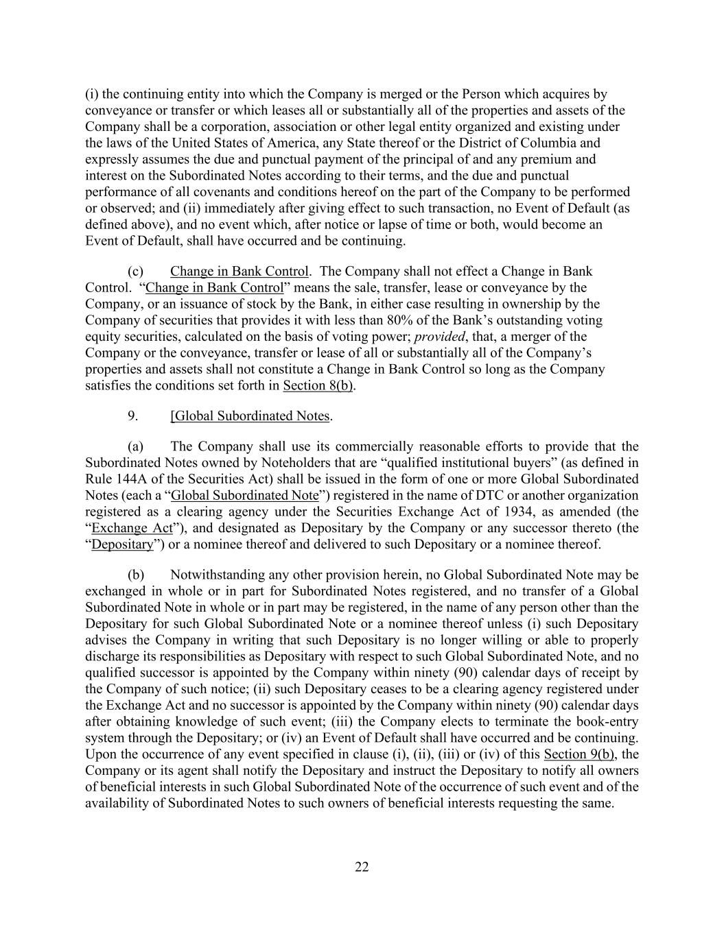 22 (i) the continuing entity into which the Company is merged or the Person which acquires by conveyance or transfer or which leases all or substantially all of the properties and assets of the Company shall be a corporation, association or other legal entity organized and existing under the laws of the United States of America, any State thereof or the District of Columbia and expressly assumes the due and punctual payment of the principal of and any premium and interest on the Subordinated Notes according to their terms, and the due and punctual performance of all covenants and conditions hereof on the part of the Company to be performed or observed; and (ii) immediately after giving effect to such transaction, no Event of Default (as defined above), and no event which, after notice or lapse of time or both, would become an Event of Default, shall have occurred and be continuing. (c) Change in Bank Control. The Company shall not effect a Change in Bank Control. “Change in Bank Control” means the sale, transfer, lease or conveyance by the Company, or an issuance of stock by the Bank, in either case resulting in ownership by the Company of securities that provides it with less than 80% of the Bank’s outstanding voting equity securities, calculated on the basis of voting power; provided, that, a merger of the Company or the conveyance, transfer or lease of all or substantially all of the Company’s properties and assets shall not constitute a Change in Bank Control so long as the Company satisfies the conditions set forth in Section 8(b). 9. [Global Subordinated Notes. (a) The Company shall use its commercially reasonable efforts to provide that the Subordinated Notes owned by Noteholders that are “qualified institutional buyers” (as defined in Rule 144A of the Securities Act) shall be issued in the form of one or more Global Subordinated Notes (each a “Global Subordinated Note”) registered in the name of DTC or another organization registered as a clearing agency under the Securities Exchange Act of 1934, as amended (the “Exchange Act”), and designated as Depositary by the Company or any successor thereto (the “Depositary”) or a nominee thereof and delivered to such Depositary or a nominee thereof. (b) Notwithstanding any other provision herein, no Global Subordinated Note may be exchanged in whole or in part for Subordinated Notes registered, and no transfer of a Global Subordinated Note in whole or in part may be registered, in the name of any person other than the Depositary for such Global Subordinated Note or a nominee thereof unless (i) such Depositary advises the Company in writing that such Depositary is no longer willing or able to properly discharge its responsibilities as Depositary with respect to such Global Subordinated Note, and no qualified successor is appointed by the Company within ninety (90) calendar days of receipt by the Company of such notice; (ii) such Depositary ceases to be a clearing agency registered under the Exchange Act and no successor is appointed by the Company within ninety (90) calendar days after obtaining knowledge of such event; (iii) the Company elects to terminate the book-entry system through the Depositary; or (iv) an Event of Default shall have occurred and be continuing. Upon the occurrence of any event specified in clause (i), (ii), (iii) or (iv) of this Section 9(b), the Company or its agent shall notify the Depositary and instruct the Depositary to notify all owners of beneficial interests in such Global Subordinated Note of the occurrence of such event and of the availability of Subordinated Notes to such owners of beneficial interests requesting the same.