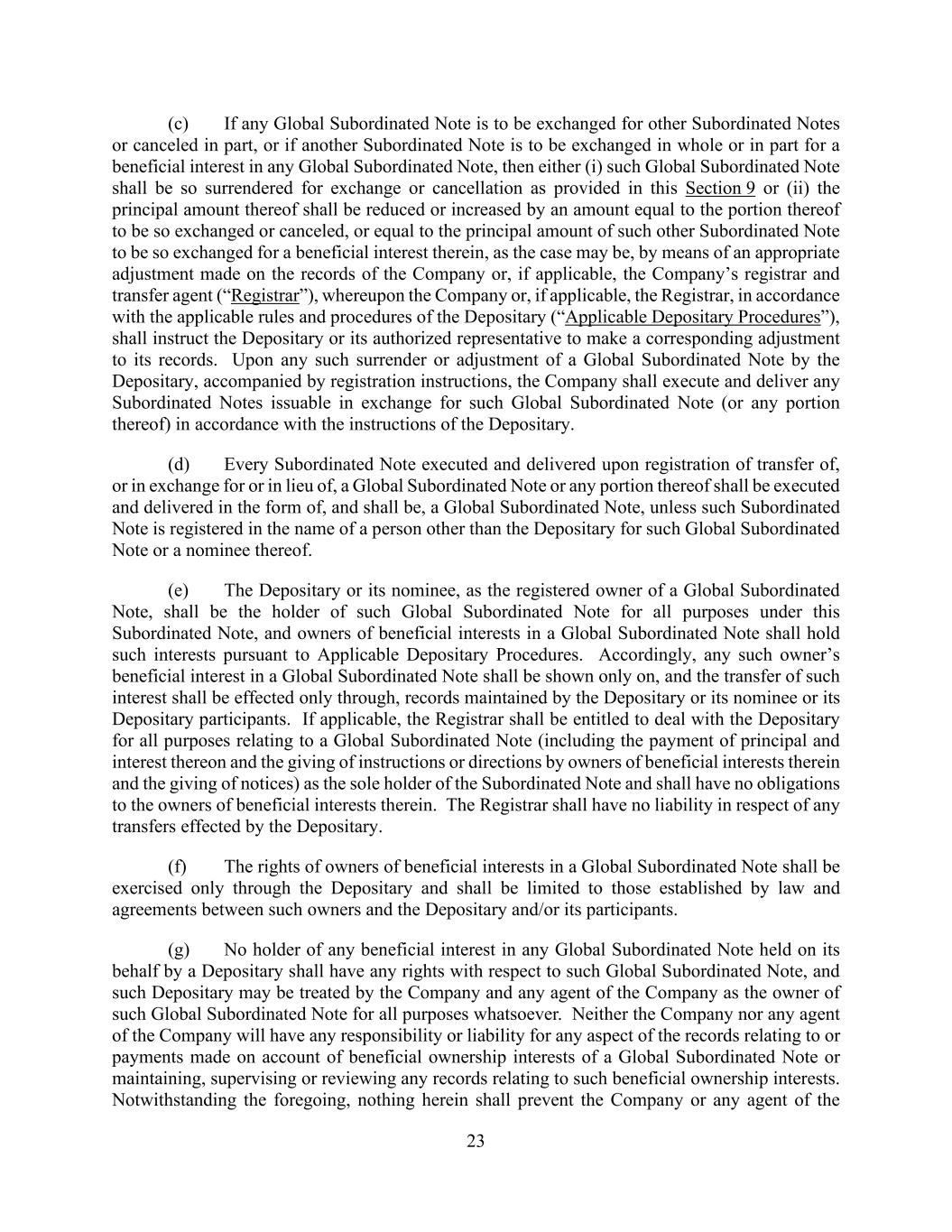 23 (c) If any Global Subordinated Note is to be exchanged for other Subordinated Notes or canceled in part, or if another Subordinated Note is to be exchanged in whole or in part for a beneficial interest in any Global Subordinated Note, then either (i) such Global Subordinated Note shall be so surrendered for exchange or cancellation as provided in this Section 9 or (ii) the principal amount thereof shall be reduced or increased by an amount equal to the portion thereof to be so exchanged or canceled, or equal to the principal amount of such other Subordinated Note to be so exchanged for a beneficial interest therein, as the case may be, by means of an appropriate adjustment made on the records of the Company or, if applicable, the Company’s registrar and transfer agent (“Registrar”), whereupon the Company or, if applicable, the Registrar, in accordance with the applicable rules and procedures of the Depositary (“Applicable Depositary Procedures”), shall instruct the Depositary or its authorized representative to make a corresponding adjustment to its records. Upon any such surrender or adjustment of a Global Subordinated Note by the Depositary, accompanied by registration instructions, the Company shall execute and deliver any Subordinated Notes issuable in exchange for such Global Subordinated Note (or any portion thereof) in accordance with the instructions of the Depositary. (d) Every Subordinated Note executed and delivered upon registration of transfer of, or in exchange for or in lieu of, a Global Subordinated Note or any portion thereof shall be executed and delivered in the form of, and shall be, a Global Subordinated Note, unless such Subordinated Note is registered in the name of a person other than the Depositary for such Global Subordinated Note or a nominee thereof. (e) The Depositary or its nominee, as the registered owner of a Global Subordinated Note, shall be the holder of such Global Subordinated Note for all purposes under this Subordinated Note, and owners of beneficial interests in a Global Subordinated Note shall hold such interests pursuant to Applicable Depositary Procedures. Accordingly, any such owner’s beneficial interest in a Global Subordinated Note shall be shown only on, and the transfer of such interest shall be effected only through, records maintained by the Depositary or its nominee or its Depositary participants. If applicable, the Registrar shall be entitled to deal with the Depositary for all purposes relating to a Global Subordinated Note (including the payment of principal and interest thereon and the giving of instructions or directions by owners of beneficial interests therein and the giving of notices) as the sole holder of the Subordinated Note and shall have no obligations to the owners of beneficial interests therein. The Registrar shall have no liability in respect of any transfers effected by the Depositary. (f) The rights of owners of beneficial interests in a Global Subordinated Note shall be exercised only through the Depositary and shall be limited to those established by law and agreements between such owners and the Depositary and/or its participants. (g) No holder of any beneficial interest in any Global Subordinated Note held on its behalf by a Depositary shall have any rights with respect to such Global Subordinated Note, and such Depositary may be treated by the Company and any agent of the Company as the owner of such Global Subordinated Note for all purposes whatsoever. Neither the Company nor any agent of the Company will have any responsibility or liability for any aspect of the records relating to or payments made on account of beneficial ownership interests of a Global Subordinated Note or maintaining, supervising or reviewing any records relating to such beneficial ownership interests. Notwithstanding the foregoing, nothing herein shall prevent the Company or any agent of the