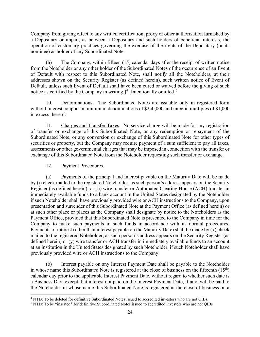 24 Company from giving effect to any written certification, proxy or other authorization furnished by a Depositary or impair, as between a Depositary and such holders of beneficial interests, the operation of customary practices governing the exercise of the rights of the Depositary (or its nominee) as holder of any Subordinated Note. (h) The Company, within fifteen (15) calendar days after the receipt of written notice from the Noteholder or any other holder of the Subordinated Notes of the occurrence of an Event of Default with respect to this Subordinated Note, shall notify all the Noteholders, at their addresses shown on the Security Register (as defined herein), such written notice of Event of Default, unless such Event of Default shall have been cured or waived before the giving of such notice as certified by the Company in writing.]4 [Intentionally omitted]5 10. Denominations. The Subordinated Notes are issuable only in registered form without interest coupons in minimum denominations of $250,000 and integral multiples of $1,000 in excess thereof. 11. Charges and Transfer Taxes. No service charge will be made for any registration of transfer or exchange of this Subordinated Note, or any redemption or repayment of the Subordinated Note, or any conversion or exchange of this Subordinated Note for other types of securities or property, but the Company may require payment of a sum sufficient to pay all taxes, assessments or other governmental charges that may be imposed in connection with the transfer or exchange of this Subordinated Note from the Noteholder requesting such transfer or exchange. 12. Payment Procedures. (a) Payments of the principal and interest payable on the Maturity Date will be made by (i) check mailed to the registered Noteholder, as such person’s address appears on the Security Register (as defined herein), or (ii) wire transfer or Automated Clearing House (ACH) transfer in immediately available funds to a bank account in the United States designated by the Noteholder if such Noteholder shall have previously provided wire or ACH instructions to the Company, upon presentation and surrender of this Subordinated Note at the Payment Office (as defined herein) or at such other place or places as the Company shall designate by notice to the Noteholders as the Payment Office, provided that this Subordinated Note is presented to the Company in time for the Company to make such payments in such funds in accordance with its normal procedures. Payments of interest (other than interest payable on the Maturity Date) shall be made by (x) check mailed to the registered Noteholder, as such person’s address appears on the Security Register (as defined herein) or (y) wire transfer or ACH transfer in immediately available funds to an account at an institution in the United States designated by such Noteholder, if such Noteholder shall have previously provided wire or ACH instructions to the Company. (b) Interest payable on any Interest Payment Date shall be payable to the Noteholder in whose name this Subordinated Note is registered at the close of business on the fifteenth (15th) calendar day prior to the applicable Interest Payment Date, without regard to whether such date is a Business Day, except that interest not paid on the Interest Payment Date, if any, will be paid to the Noteholder in whose name this Subordinated Note is registered at the close of business on a 4 NTD: To be deleted for definitive Subordinated Notes issued to accredited investors who are not QIBs. 5 NTD: To be *inserted* for definitive Subordinated Notes issued to accredited investors who are not QIBs