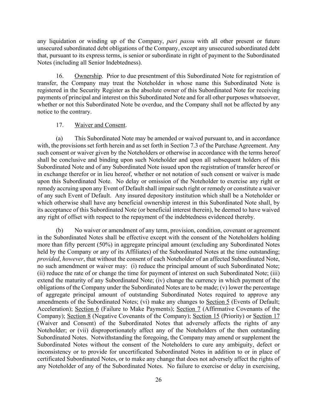 26 any liquidation or winding up of the Company, pari passu with all other present or future unsecured subordinated debt obligations of the Company, except any unsecured subordinated debt that, pursuant to its express terms, is senior or subordinate in right of payment to the Subordinated Notes (including all Senior Indebtedness). 16. Ownership. Prior to due presentment of this Subordinated Note for registration of transfer, the Company may treat the Noteholder in whose name this Subordinated Note is registered in the Security Register as the absolute owner of this Subordinated Note for receiving payments of principal and interest on this Subordinated Note and for all other purposes whatsoever, whether or not this Subordinated Note be overdue, and the Company shall not be affected by any notice to the contrary. 17. Waiver and Consent. (a) This Subordinated Note may be amended or waived pursuant to, and in accordance with, the provisions set forth herein and as set forth in Section 7.3 of the Purchase Agreement. Any such consent or waiver given by the Noteholders or otherwise in accordance with the terms hereof shall be conclusive and binding upon such Noteholder and upon all subsequent holders of this Subordinated Note and of any Subordinated Note issued upon the registration of transfer hereof or in exchange therefor or in lieu hereof, whether or not notation of such consent or waiver is made upon this Subordinated Note. No delay or omission of the Noteholder to exercise any right or remedy accruing upon any Event of Default shall impair such right or remedy or constitute a waiver of any such Event of Default. Any insured depository institution which shall be a Noteholder or which otherwise shall have any beneficial ownership interest in this Subordinated Note shall, by its acceptance of this Subordinated Note (or beneficial interest therein), be deemed to have waived any right of offset with respect to the repayment of the indebtedness evidenced thereby. (b) No waiver or amendment of any term, provision, condition, covenant or agreement in the Subordinated Notes shall be effective except with the consent of the Noteholders holding more than fifty percent (50%) in aggregate principal amount (excluding any Subordinated Notes held by the Company or any of its Affiliates) of the Subordinated Notes at the time outstanding; provided, however, that without the consent of each Noteholder of an affected Subordinated Note, no such amendment or waiver may: (i) reduce the principal amount of such Subordinated Note; (ii) reduce the rate of or change the time for payment of interest on such Subordinated Note; (iii) extend the maturity of any Subordinated Note; (iv) change the currency in which payment of the obligations of the Company under the Subordinated Notes are to be made; (v) lower the percentage of aggregate principal amount of outstanding Subordinated Notes required to approve any amendments of the Subordinated Notes; (vi) make any changes to Section 5 (Events of Default; Acceleration); Section 6 (Failure to Make Payments); Section 7 (Affirmative Covenants of the Company); Section 8 (Negative Covenants of the Company); Section 15 (Priority) or Section 17 (Waiver and Consent) of the Subordinated Notes that adversely affects the rights of any Noteholder; or (vii) disproportionately affect any of the Noteholders of the then outstanding Subordinated Notes. Notwithstanding the foregoing, the Company may amend or supplement the Subordinated Notes without the consent of the Noteholders to cure any ambiguity, defect or inconsistency or to provide for uncertificated Subordinated Notes in addition to or in place of certificated Subordinated Notes, or to make any change that does not adversely affect the rights of any Noteholder of any of the Subordinated Notes. No failure to exercise or delay in exercising,