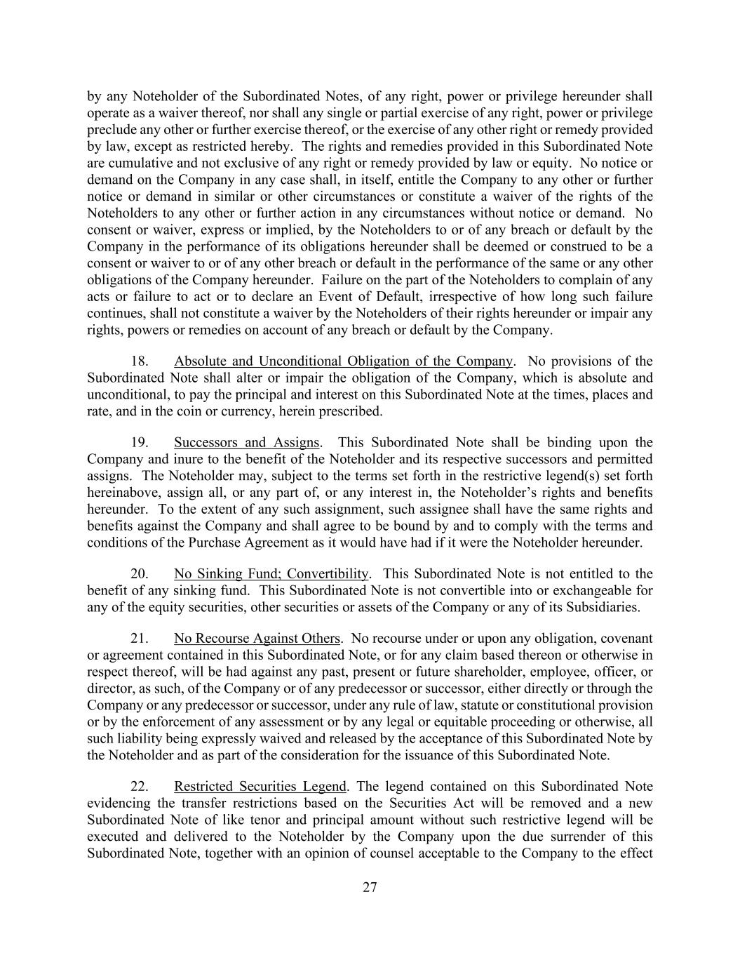27 by any Noteholder of the Subordinated Notes, of any right, power or privilege hereunder shall operate as a waiver thereof, nor shall any single or partial exercise of any right, power or privilege preclude any other or further exercise thereof, or the exercise of any other right or remedy provided by law, except as restricted hereby. The rights and remedies provided in this Subordinated Note are cumulative and not exclusive of any right or remedy provided by law or equity. No notice or demand on the Company in any case shall, in itself, entitle the Company to any other or further notice or demand in similar or other circumstances or constitute a waiver of the rights of the Noteholders to any other or further action in any circumstances without notice or demand. No consent or waiver, express or implied, by the Noteholders to or of any breach or default by the Company in the performance of its obligations hereunder shall be deemed or construed to be a consent or waiver to or of any other breach or default in the performance of the same or any other obligations of the Company hereunder. Failure on the part of the Noteholders to complain of any acts or failure to act or to declare an Event of Default, irrespective of how long such failure continues, shall not constitute a waiver by the Noteholders of their rights hereunder or impair any rights, powers or remedies on account of any breach or default by the Company. 18. Absolute and Unconditional Obligation of the Company. No provisions of the Subordinated Note shall alter or impair the obligation of the Company, which is absolute and unconditional, to pay the principal and interest on this Subordinated Note at the times, places and rate, and in the coin or currency, herein prescribed. 19. Successors and Assigns. This Subordinated Note shall be binding upon the Company and inure to the benefit of the Noteholder and its respective successors and permitted assigns. The Noteholder may, subject to the terms set forth in the restrictive legend(s) set forth hereinabove, assign all, or any part of, or any interest in, the Noteholder’s rights and benefits hereunder. To the extent of any such assignment, such assignee shall have the same rights and benefits against the Company and shall agree to be bound by and to comply with the terms and conditions of the Purchase Agreement as it would have had if it were the Noteholder hereunder. 20. No Sinking Fund; Convertibility. This Subordinated Note is not entitled to the benefit of any sinking fund. This Subordinated Note is not convertible into or exchangeable for any of the equity securities, other securities or assets of the Company or any of its Subsidiaries. 21. No Recourse Against Others. No recourse under or upon any obligation, covenant or agreement contained in this Subordinated Note, or for any claim based thereon or otherwise in respect thereof, will be had against any past, present or future shareholder, employee, officer, or director, as such, of the Company or of any predecessor or successor, either directly or through the Company or any predecessor or successor, under any rule of law, statute or constitutional provision or by the enforcement of any assessment or by any legal or equitable proceeding or otherwise, all such liability being expressly waived and released by the acceptance of this Subordinated Note by the Noteholder and as part of the consideration for the issuance of this Subordinated Note. 22. Restricted Securities Legend. The legend contained on this Subordinated Note evidencing the transfer restrictions based on the Securities Act will be removed and a new Subordinated Note of like tenor and principal amount without such restrictive legend will be executed and delivered to the Noteholder by the Company upon the due surrender of this Subordinated Note, together with an opinion of counsel acceptable to the Company to the effect