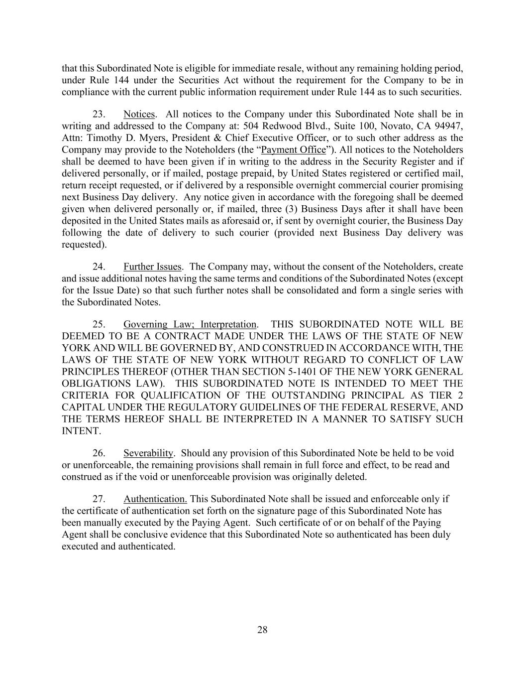 28 that this Subordinated Note is eligible for immediate resale, without any remaining holding period, under Rule 144 under the Securities Act without the requirement for the Company to be in compliance with the current public information requirement under Rule 144 as to such securities. 23. Notices. All notices to the Company under this Subordinated Note shall be in writing and addressed to the Company at: 504 Redwood Blvd., Suite 100, Novato, CA 94947, Attn: Timothy D. Myers, President & Chief Executive Officer, or to such other address as the Company may provide to the Noteholders (the “Payment Office”). All notices to the Noteholders shall be deemed to have been given if in writing to the address in the Security Register and if delivered personally, or if mailed, postage prepaid, by United States registered or certified mail, return receipt requested, or if delivered by a responsible overnight commercial courier promising next Business Day delivery. Any notice given in accordance with the foregoing shall be deemed given when delivered personally or, if mailed, three (3) Business Days after it shall have been deposited in the United States mails as aforesaid or, if sent by overnight courier, the Business Day following the date of delivery to such courier (provided next Business Day delivery was requested). 24. Further Issues. The Company may, without the consent of the Noteholders, create and issue additional notes having the same terms and conditions of the Subordinated Notes (except for the Issue Date) so that such further notes shall be consolidated and form a single series with the Subordinated Notes. 25. Governing Law; Interpretation. THIS SUBORDINATED NOTE WILL BE DEEMED TO BE A CONTRACT MADE UNDER THE LAWS OF THE STATE OF NEW YORK AND WILL BE GOVERNED BY, AND CONSTRUED IN ACCORDANCE WITH, THE LAWS OF THE STATE OF NEW YORK WITHOUT REGARD TO CONFLICT OF LAW PRINCIPLES THEREOF (OTHER THAN SECTION 5-1401 OF THE NEW YORK GENERAL OBLIGATIONS LAW). THIS SUBORDINATED NOTE IS INTENDED TO MEET THE CRITERIA FOR QUALIFICATION OF THE OUTSTANDING PRINCIPAL AS TIER 2 CAPITAL UNDER THE REGULATORY GUIDELINES OF THE FEDERAL RESERVE, AND THE TERMS HEREOF SHALL BE INTERPRETED IN A MANNER TO SATISFY SUCH INTENT. 26. Severability. Should any provision of this Subordinated Note be held to be void or unenforceable, the remaining provisions shall remain in full force and effect, to be read and construed as if the void or unenforceable provision was originally deleted. 27. Authentication. This Subordinated Note shall be issued and enforceable only if the certificate of authentication set forth on the signature page of this Subordinated Note has been manually executed by the Paying Agent. Such certificate of or on behalf of the Paying Agent shall be conclusive evidence that this Subordinated Note so authenticated has been duly executed and authenticated.