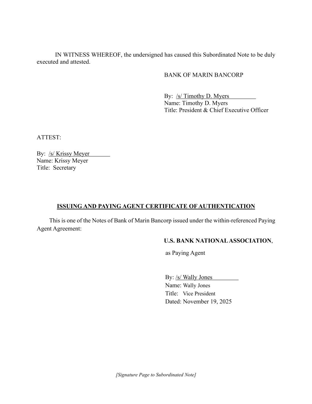 [Signature Page to Subordinated Note] IN WITNESS WHEREOF, the undersigned has caused this Subordinated Note to be duly executed and attested. BANK OF MARIN BANCORP By: /s/ Timothy D. Myers Name: Timothy D. Myers Title: President & Chief Executive Officer ATTEST: By: /s/ Krissy Meyer Name: Krissy Meyer Title: Secretary ISSUING AND PAYING AGENT CERTIFICATE OF AUTHENTICATION This is one of the Notes of Bank of Marin Bancorp issued under the within-referenced Paying Agent Agreement: U.S. BANK NATIONAL ASSOCIATION, as Paying Agent By: /s/ Wally Jones Name: Wally Jones Title: Vice President Dated: November 19, 2025