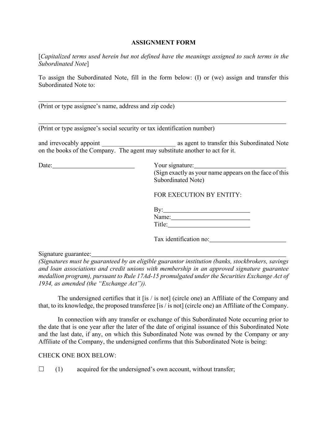 ASSIGNMENT FORM [Capitalized terms used herein but not defined have the meanings assigned to such terms in the Subordinated Note] To assign the Subordinated Note, fill in the form below: (I) or (we) assign and transfer this Subordinated Note to: (Print or type assignee’s name, address and zip code) (Print or type assignee’s social security or tax identification number) and irrevocably appoint _______________________ as agent to transfer this Subordinated Note on the books of the Company. The agent may substitute another to act for it. Date: Your signature: (Sign exactly as your name appears on the face of this Subordinated Note) FOR EXECUTION BY ENTITY: By: Name: Title: Tax identification no: Signature guarantee: (Signatures must be guaranteed by an eligible guarantor institution (banks, stockbrokers, savings and loan associations and credit unions with membership in an approved signature guarantee medallion program), pursuant to Rule 17Ad-15 promulgated under the Securities Exchange Act of 1934, as amended (the “Exchange Act”)). The undersigned certifies that it [is / is not] (circle one) an Affiliate of the Company and that, to its knowledge, the proposed transferee [is / is not] (circle one) an Affiliate of the Company. In connection with any transfer or exchange of this Subordinated Note occurring prior to the date that is one year after the later of the date of original issuance of this Subordinated Note and the last date, if any, on which this Subordinated Note was owned by the Company or any Affiliate of the Company, the undersigned confirms that this Subordinated Note is being: CHECK ONE BOX BELOW:  (1) acquired for the undersigned’s own account, without transfer;