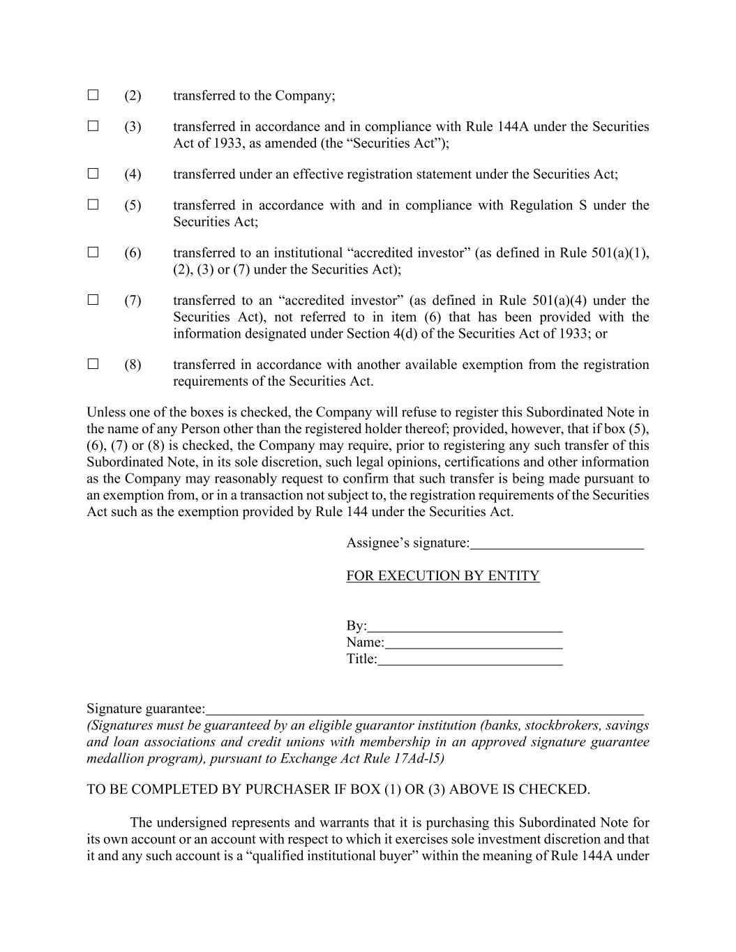  (2) transferred to the Company;  (3) transferred in accordance and in compliance with Rule 144A under the Securities Act of 1933, as amended (the “Securities Act”);  (4) transferred under an effective registration statement under the Securities Act;  (5) transferred in accordance with and in compliance with Regulation S under the Securities Act;  (6) transferred to an institutional “accredited investor” (as defined in Rule 501(a)(1), (2), (3) or (7) under the Securities Act);  (7) transferred to an “accredited investor” (as defined in Rule 501(a)(4) under the Securities Act), not referred to in item (6) that has been provided with the information designated under Section 4(d) of the Securities Act of 1933; or  (8) transferred in accordance with another available exemption from the registration requirements of the Securities Act. Unless one of the boxes is checked, the Company will refuse to register this Subordinated Note in the name of any Person other than the registered holder thereof; provided, however, that if box (5), (6), (7) or (8) is checked, the Company may require, prior to registering any such transfer of this Subordinated Note, in its sole discretion, such legal opinions, certifications and other information as the Company may reasonably request to confirm that such transfer is being made pursuant to an exemption from, or in a transaction not subject to, the registration requirements of the Securities Act such as the exemption provided by Rule 144 under the Securities Act. Assignee’s signature: FOR EXECUTION BY ENTITY By: Name: Title: Signature guarantee: (Signatures must be guaranteed by an eligible guarantor institution (banks, stockbrokers, savings and loan associations and credit unions with membership in an approved signature guarantee medallion program), pursuant to Exchange Act Rule 17Ad-l5) TO BE COMPLETED BY PURCHASER IF BOX (1) OR (3) ABOVE IS CHECKED. The undersigned represents and warrants that it is purchasing this Subordinated Note for its own account or an account with respect to which it exercises sole investment discretion and that it and any such account is a “qualified institutional buyer” within the meaning of Rule 144A under