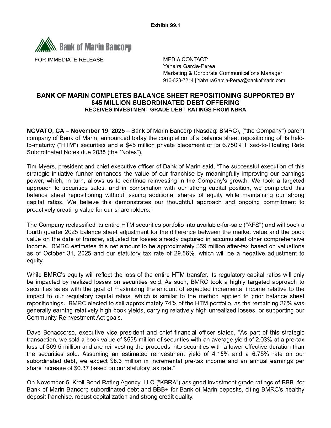 Exhibit 99.1 FOR IMMEDIATE RELEASE MEDIA CONTACT: Yahaira Garcia-Perea Marketing & Corporate Communications Manager 916-823-7214 | YahairaGarcia-Perea@bankofmarin.com BANK OF MARIN COMPLETES BALANCE SHEET REPOSITIONING SUPPORTED BY $45 MILLION SUBORDINATED DEBT OFFERING RECEIVES INVESTMENT GRADE DEBT RATINGS FROM KBRA NOVATO, CA – November 19, 2025 – Bank of Marin Bancorp (Nasdaq: BMRC), ("the Company") parent company of Bank of Marin, announced today the completion of a balance sheet repositioning of its held- to-maturity ("HTM") securities and a $45 million private placement of its 6.750% Fixed-to-Floating Rate Subordinated Notes due 2035 (the “Notes”). Tim Myers, president and chief executive officer of Bank of Marin said, “The successful execution of this strategic initiative further enhances the value of our franchise by meaningfully improving our earnings power, which, in turn, allows us to continue reinvesting in the Company's growth. We took a targeted approach to securities sales, and in combination with our strong capital position, we completed this balance sheet repositioning without issuing additional shares of equity while maintaining our strong capital ratios. We believe this demonstrates our thoughtful approach and ongoing commitment to proactively creating value for our shareholders.” The Company reclassified its entire HTM securities portfolio into available-for-sale ("AFS") and will book a fourth quarter 2025 balance sheet adjustment for the difference between the market value and the book value on the date of transfer, adjusted for losses already captured in accumulated other comprehensive income. BMRC estimates this net amount to be approximately $59 million after-tax based on valuations as of October 31, 2025 and our statutory tax rate of 29.56%, which will be a negative adjustment to equity. While BMRC's equity will reflect the loss of the entire HTM transfer, its regulatory capital ratios will only be impacted by realized losses on securities sold. As such, BMRC took a highly targeted approach to securities sales with the goal of maximizing the amount of expected incremental income relative to the impact to our regulatory capital ratios, which is similar to the method applied to prior balance sheet repositionings. BMRC elected to sell approximately 74% of the HTM portfolio, as the remaining 26% was generally earning relatively high book yields, carrying relatively high unrealized losses, or supporting our Community Reinvestment Act goals. Dave Bonaccorso, executive vice president and chief financial officer stated, “As part of this strategic transaction, we sold a book value of $595 million of securities with an average yield of 2.03% at a pre-tax loss of $69.5 million and are reinvesting the proceeds into securities with a lower effective duration than the securities sold. Assuming an estimated reinvestment yield of 4.15% and a 6.75% rate on our subordinated debt, we expect $8.3 million in incremental pre-tax income and an annual earnings per share increase of $0.37 based on our statutory tax rate.” On November 5, Kroll Bond Rating Agency, LLC (“KBRA”) assigned investment grade ratings of BBB- for Bank of Marin Bancorp subordinated debt and BBB+ for Bank of Marin deposits, citing BMRC’s healthy deposit franchise, robust capitalization and strong credit quality.