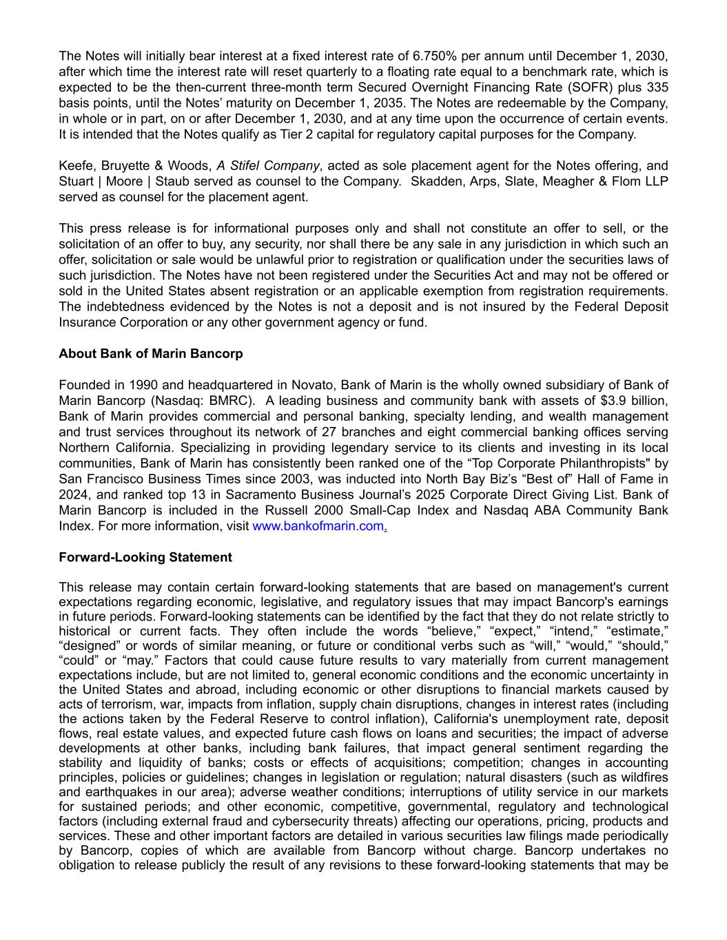 The Notes will initially bear interest at a fixed interest rate of 6.750% per annum until December 1, 2030, after which time the interest rate will reset quarterly to a floating rate equal to a benchmark rate, which is expected to be the then-current three-month term Secured Overnight Financing Rate (SOFR) plus 335 basis points, until the Notes’ maturity on December 1, 2035. The Notes are redeemable by the Company, in whole or in part, on or after December 1, 2030, and at any time upon the occurrence of certain events. It is intended that the Notes qualify as Tier 2 capital for regulatory capital purposes for the Company. Keefe, Bruyette & Woods, A Stifel Company, acted as sole placement agent for the Notes offering, and Stuart | Moore | Staub served as counsel to the Company. Skadden, Arps, Slate, Meagher & Flom LLP served as counsel for the placement agent. This press release is for informational purposes only and shall not constitute an offer to sell, or the solicitation of an offer to buy, any security, nor shall there be any sale in any jurisdiction in which such an offer, solicitation or sale would be unlawful prior to registration or qualification under the securities laws of such jurisdiction. The Notes have not been registered under the Securities Act and may not be offered or sold in the United States absent registration or an applicable exemption from registration requirements. The indebtedness evidenced by the Notes is not a deposit and is not insured by the Federal Deposit Insurance Corporation or any other government agency or fund. About Bank of Marin Bancorp Founded in 1990 and headquartered in Novato, Bank of Marin is the wholly owned subsidiary of Bank of Marin Bancorp (Nasdaq: BMRC). A leading business and community bank with assets of $3.9 billion, Bank of Marin provides commercial and personal banking, specialty lending, and wealth management and trust services throughout its network of 27 branches and eight commercial banking offices serving Northern California. Specializing in providing legendary service to its clients and investing in its local communities, Bank of Marin has consistently been ranked one of the “Top Corporate Philanthropists" by San Francisco Business Times since 2003, was inducted into North Bay Biz’s “Best of” Hall of Fame in 2024, and ranked top 13 in Sacramento Business Journal’s 2025 Corporate Direct Giving List. Bank of Marin Bancorp is included in the Russell 2000 Small-Cap Index and Nasdaq ABA Community Bank Index. For more information, visit www.bankofmarin.com. Forward-Looking Statement This release may contain certain forward-looking statements that are based on management's current expectations regarding economic, legislative, and regulatory issues that may impact Bancorp's earnings in future periods. Forward-looking statements can be identified by the fact that they do not relate strictly to historical or current facts. They often include the words “believe,” “expect,” “intend,” “estimate,” “designed” or words of similar meaning, or future or conditional verbs such as “will,” “would,” “should,” “could” or “may.” Factors that could cause future results to vary materially from current management expectations include, but are not limited to, general economic conditions and the economic uncertainty in the United States and abroad, including economic or other disruptions to financial markets caused by acts of terrorism, war, impacts from inflation, supply chain disruptions, changes in interest rates (including the actions taken by the Federal Reserve to control inflation), California's unemployment rate, deposit flows, real estate values, and expected future cash flows on loans and securities; the impact of adverse developments at other banks, including bank failures, that impact general sentiment regarding the stability and liquidity of banks; costs or effects of acquisitions; competition; changes in accounting principles, policies or guidelines; changes in legislation or regulation; natural disasters (such as wildfires and earthquakes in our area); adverse weather conditions; interruptions of utility service in our markets for sustained periods; and other economic, competitive, governmental, regulatory and technological factors (including external fraud and cybersecurity threats) affecting our operations, pricing, products and services. These and other important factors are detailed in various securities law filings made periodically by Bancorp, copies of which are available from Bancorp without charge. Bancorp undertakes no obligation to release publicly the result of any revisions to these forward-looking statements that may be