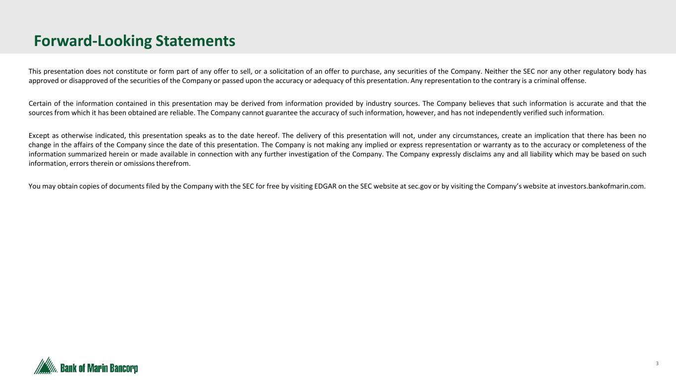2 Forward-Looking Statements This discussion of financial results includes forward-looking statements within the meaning of Section 27A of the Securities Act of 1933, as amended, (the "1933 Act") and Section 21E of the Securities Exchange Act of 1934, as amended, (the "1934 Act"). Those sections of the 1933 Act and 1934 Act provide a "safe harbor" for forward-looking statements to encourage companies to provide prospective information about their financial performance so long as they provide meaningful, cautionary statements identifying important factors that could cause actual results to differ significantly from projected results. Our forward-looking statements include descriptions of plans or objectives of management for future operations, products or services, and forecasts of revenues, earnings or other measures of economic performance. Forward-looking statements can be identified by the fact that they do not relate strictly to historical or current facts. They often include the words "believe," "expect," "intend," "estimate" or words of similar meaning, or future or conditional verbs preceded by "will," "would," "should," "could" or "may." Forward-looking statements are based on management's current expectations regarding economic, legislative, and regulatory issues that may affect our earnings in future periods. Factors that could cause future results to vary materially from current management expectations include, but are not limited to, general economic conditions and the economic uncertainty in the United States and abroad, including economic or other disruptions to financial markets caused by the Trump administration's approach to tariffs and trade, acts of terrorism, war, impacts from inflation, supply chain disruptions, changes in interest rates (including the actions taken by the Federal Reserve to control inflation), California's unemployment rate, deposit flows, real estate values, and expected future cash flows on loans and securities; the impact of adverse developments at other banks, including bank failures, that impact general sentiment regarding the stability and liquidity of banks; costs or effects of acquisitions; competition; changes in accounting principles, policies or guidelines; changes in legislation or regulation; natural disasters (such as wildfires and earthquakes in our area); adverse weather conditions; interruptions of utility service in our markets for sustained periods; and other economic, competitive, governmental, regulatory and technological factors (including external fraud and cybersecurity threats) affecting our operations, pricing, products and services; and successful integration of acquisitions. These and other important factors detailed in various securities law filings made periodically by Bancorp, copies of which are available from us at no charge. Forward-looking statements speak only as of the date they are made. Bancorp undertakes no obligation to release publicly the result of any revisions to these forward-looking statements that may be made to reflect events or circumstances that occur after the date of this press release or to reflect the occurrence of unanticipated events. GAAP to Non-GAAP Financial Measures This presentation includes some non-GAAP financial measures as shown in the Appendix of this presentation. Please refer to the reconciliation of GAAP to Non-GAAP financial measures included in our Form 8-K under Item 9 - Financial Statements and Exhibit 99.1 filed with the SEC on October 27, 2025.