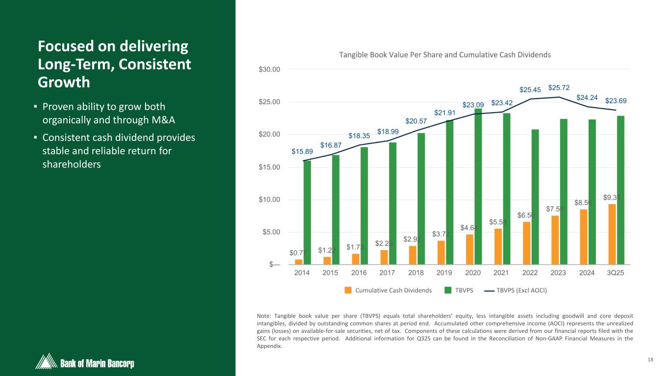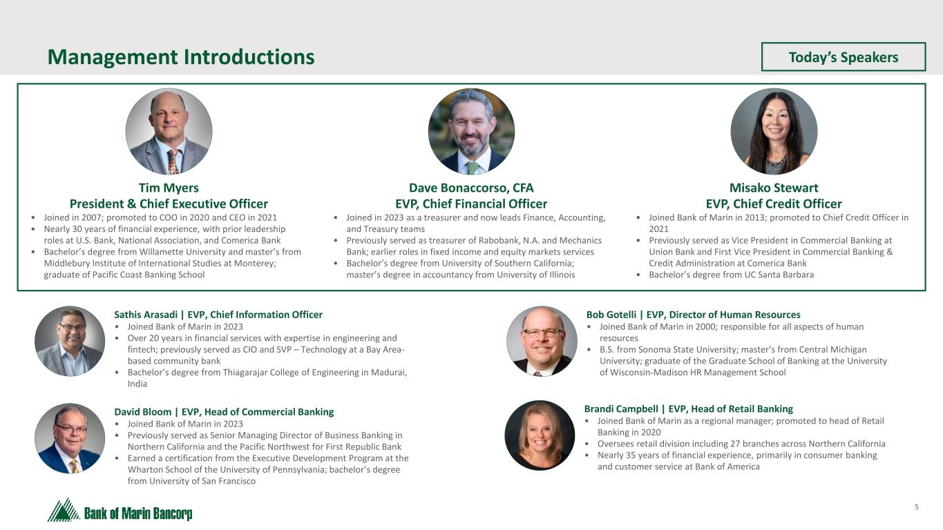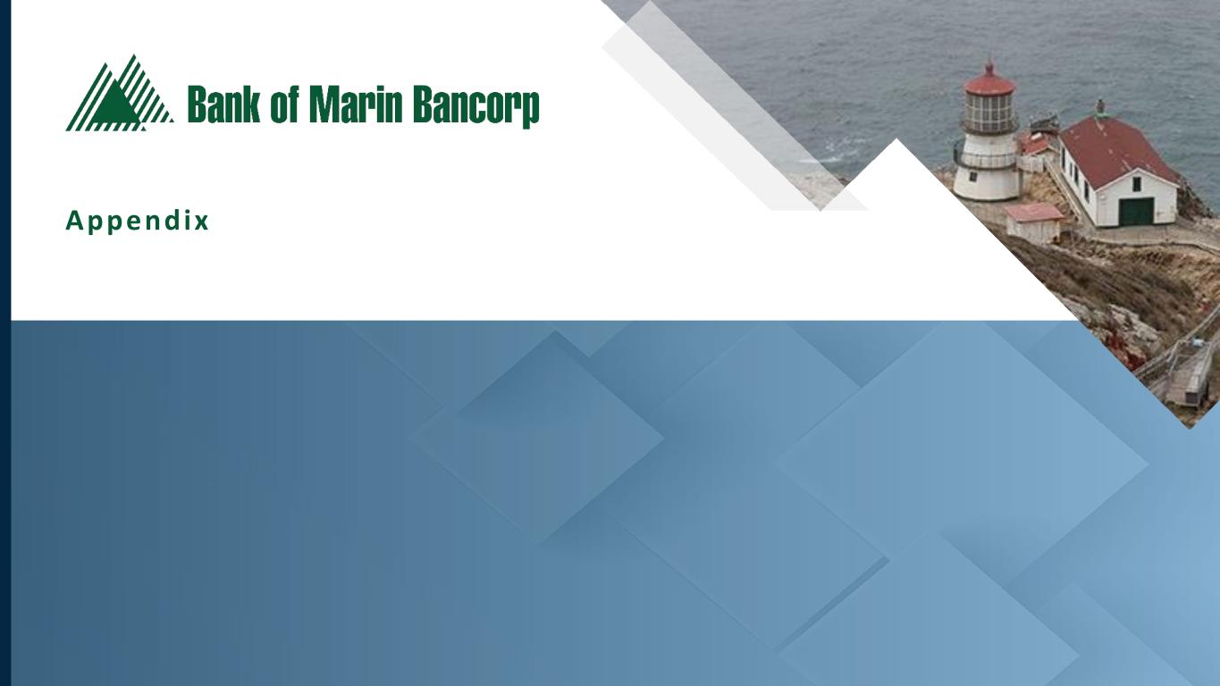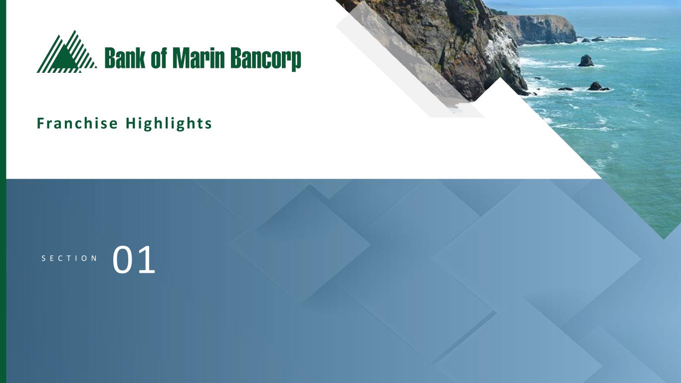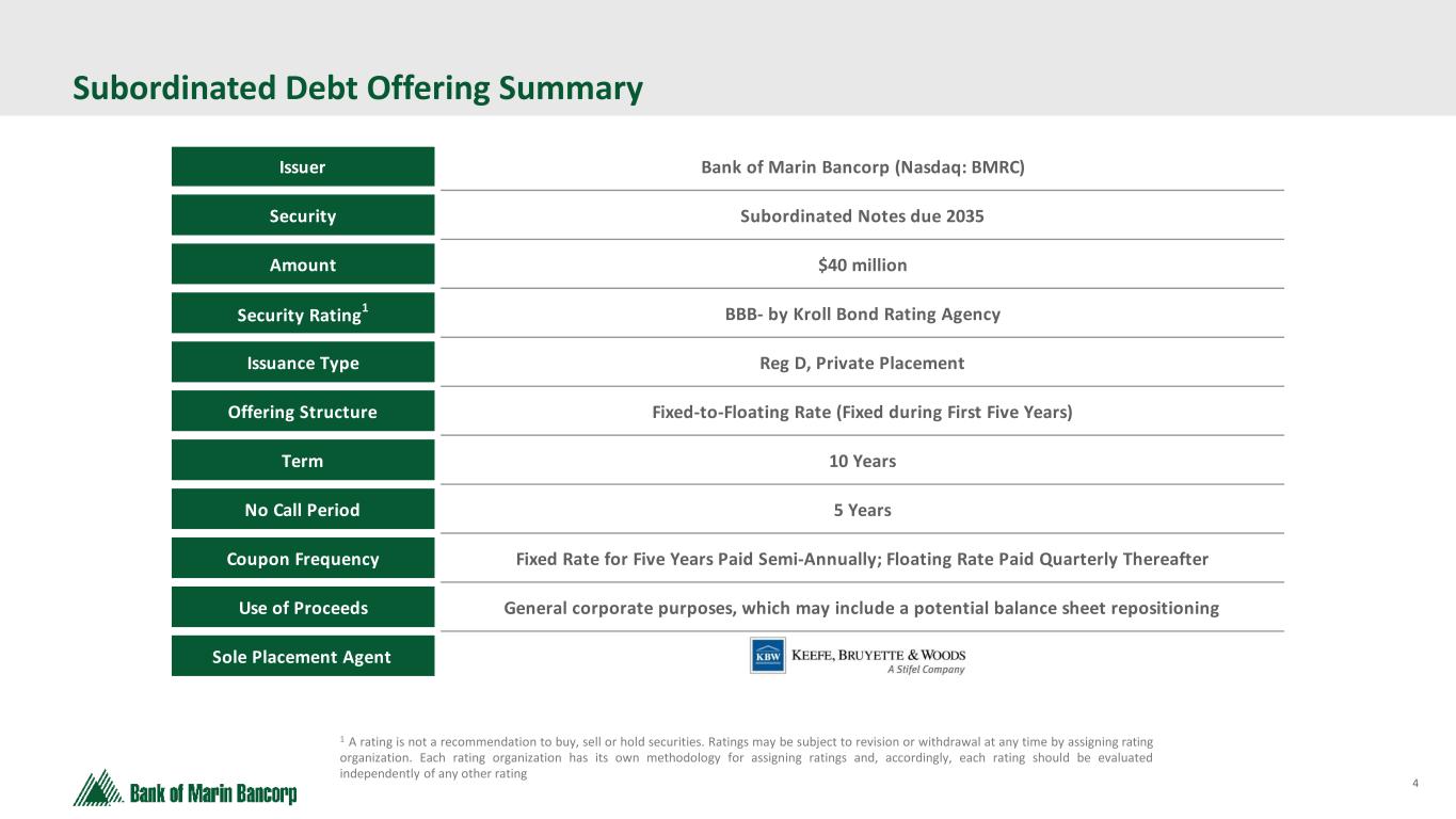 3 Forward-Looking Statements This presentation does not constitute or form part of any offer to sell, or a solicitation of an offer to purchase, any securities of the Company. Neither the SEC nor any other regulatory body has approved or disapproved of the securities of the Company or passed upon the accuracy or adequacy of this presentation. Any representation to the contrary is a criminal offense. Certain of the information contained in this presentation may be derived from information provided by industry sources. The Company believes that such information is accurate and that the sources from which it has been obtained are reliable. The Company cannot guarantee the accuracy of such information, however, and has not independently verified such information. Except as otherwise indicated, this presentation speaks as to the date hereof. The delivery of this presentation will not, under any circumstances, create an implication that there has been no change in the affairs of the Company since the date of this presentation. The Company is not making any implied or express representation or warranty as to the accuracy or completeness of the information summarized herein or made available in connection with any further investigation of the Company. The Company expressly disclaims any and all liability which may be based on such information, errors therein or omissions therefrom. You may obtain copies of documents filed by the Company with the SEC for free by visiting EDGAR on the SEC website at sec.gov or by visiting the Company’s website at investors.bankofmarin.com.