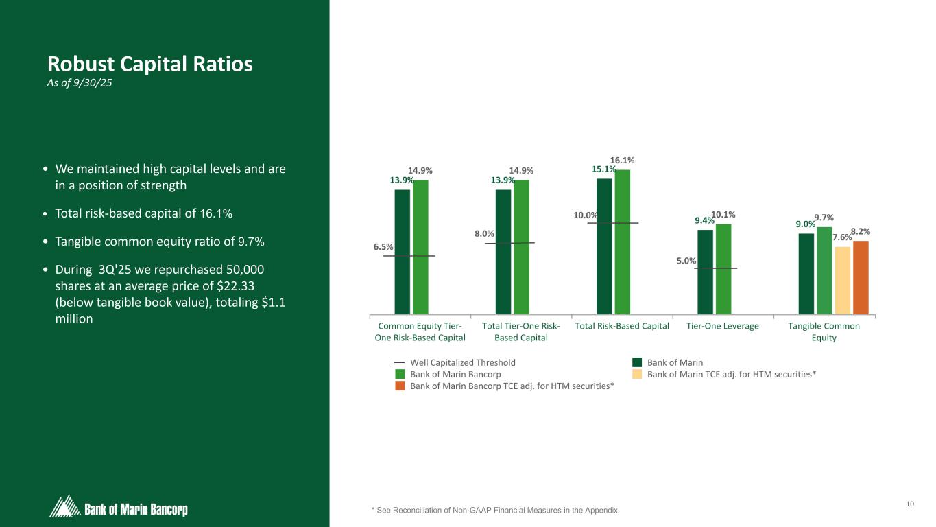 9 Focused on Building Long-Term Stakeholder Value Strong Core Deposit Franchise Largest community bank in Marin County with 11.4% market share 1 43.1% non-interest bearing deposits with a 1.29% cost of deposits in Q3 Improving Margin Outlook Improving asset yield due to: ▪ investment securities restructuring ▪ higher average loan rates continue in Q3 Seasoned Risk Management Classified loans as a percentage of loans decreased 59bps quarter over quarter Non-accrual loans as a percentage of loans decreased 6bps quarter over quarter Low NOO CRE office exposure in the City of San Francisco at 3% of total loans (5% of total NOO-CRE) and a weighted average 64% LTV Prudent Loan Growth Markets with proven track record of organic growth Organic originations increased by 36% in Q3 Key opportunistic relationship banking talent acquisitions 62% loan-to-deposit ratio provides runway for additional growth Robust Capital Levels & Liquidity Regulatory capital ratios remain comfortably above “well-capitalized” thresholds $2.0 billion in available liquidity 1Source: S&P Global Market Intelligence - FDIC deposit market share data as of June 30, 2025