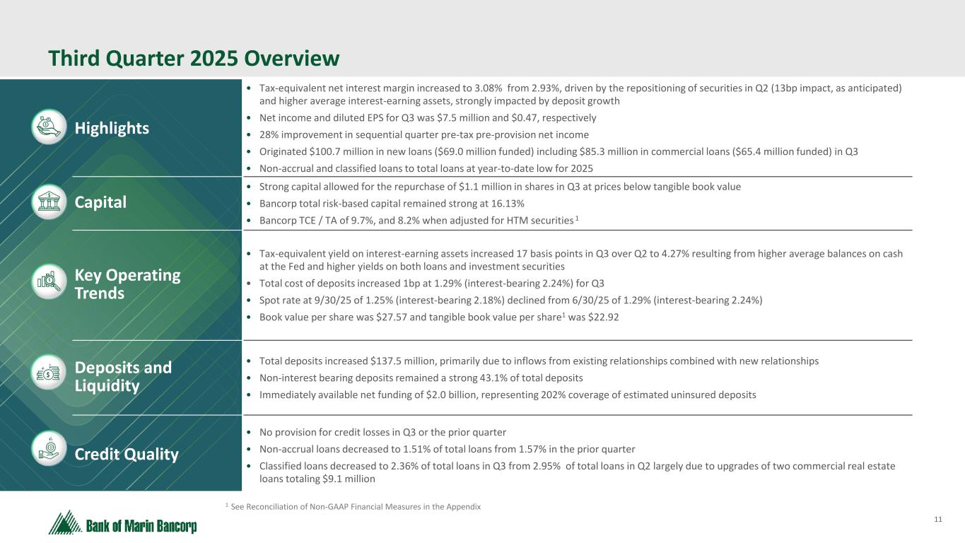 10 Robust Capital Ratios As of 9/30/25 • We maintained high capital levels and are in a position of strength • Total risk-based capital of 16.1% • Tangible common equity ratio of 9.7% • During 3Q'25 we repurchased 50,000 shares at an average price of $22.33 (below tangible book value), totaling $1.1 million * See Reconciliation of Non-GAAP Financial Measures in the Appendix.