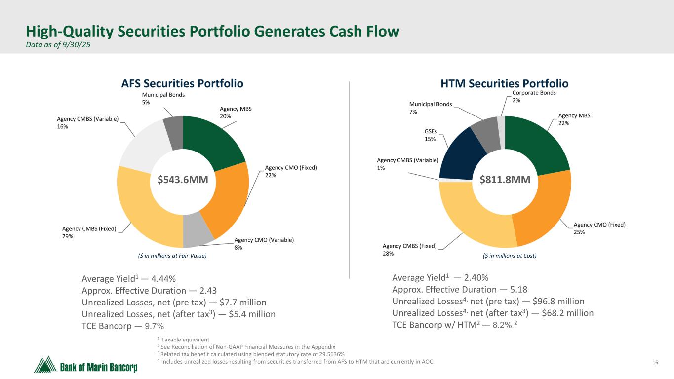 15 Strong Liquidity: $2.0 Billion in Net Availability • Immediately available contingent funding represented 202% of estimated uninsured and/or uncollateralized deposits at September 30, 2025 • The Bank has long-established minimum liquidity requirements regularly monitored using metrics and tools similar to larger banks, such as the liquidity coverage ratio and multi-scenario, long-horizon stress tests • Deposit outflow assumptions for liquidity monitoring and stress testing are conservative relative to actual experience Liquidity & Uninsured Deposits ($ in millions) 2.0x Coverage Ratio At September 30, 2025 ($ in millions) Total Available Amount Used Net Availability Internal Sources Unrestricted Cash 1 $ 201.4 N/A $ 201.4 Unencumbered Securities 442.2 N/A 442.2 External Sources FHLB line of credit 931.4 — 931.4 FRB line of credit 326.3 — 326.3 Lines of credit at correspondent banks 125.0 — 125.0 Total Liquidity $ 2,026.3 $ — $ 2,026.3 1 Excludes cash items in transit Note: Access to brokered deposit purchases through networks such as Intrafi and Reich & Tang and brokered CD sales not included above