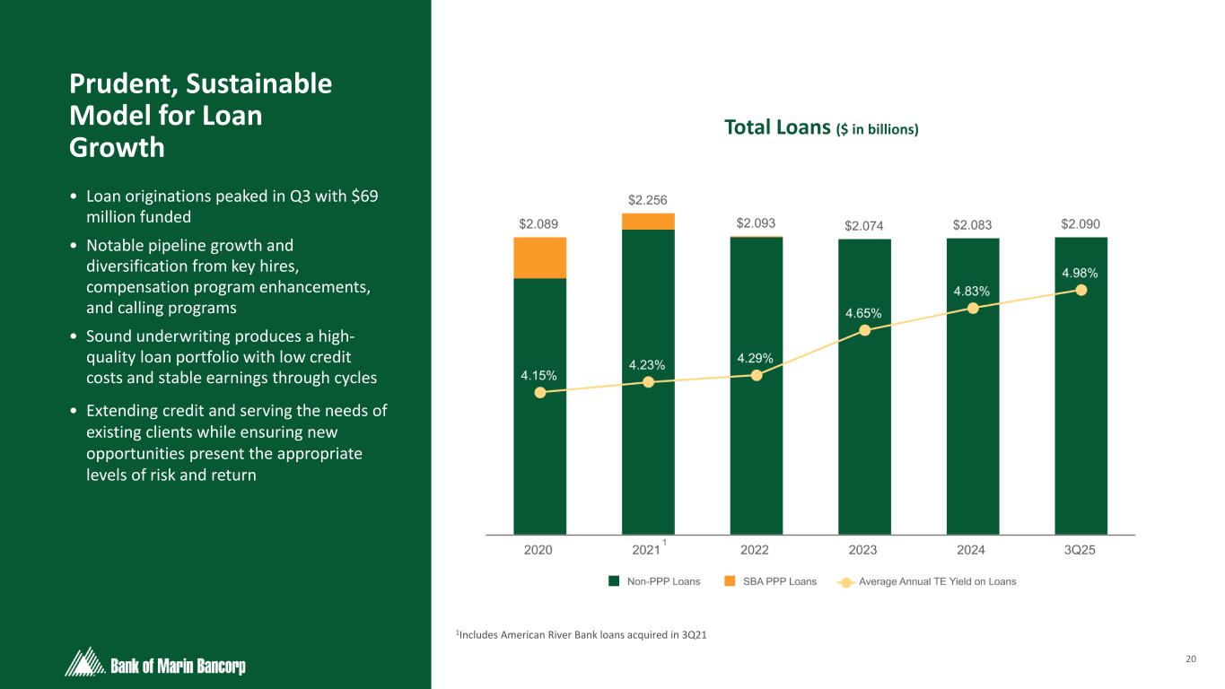 20 • Loan originations peaked in Q3 with $69 million funded • Notable pipeline growth and diversification from key hires, compensation program enhancements, and calling programs • Sound underwriting produces a high- quality loan portfolio with low credit costs and stable earnings through cycles • Extending credit and serving the needs of existing clients while ensuring new opportunities present the appropriate levels of risk and return Prudent, Sustainable Model for Loan Growth Total Loans ($ in billions) 1Includes American River Bank loans acquired in 3Q21 1