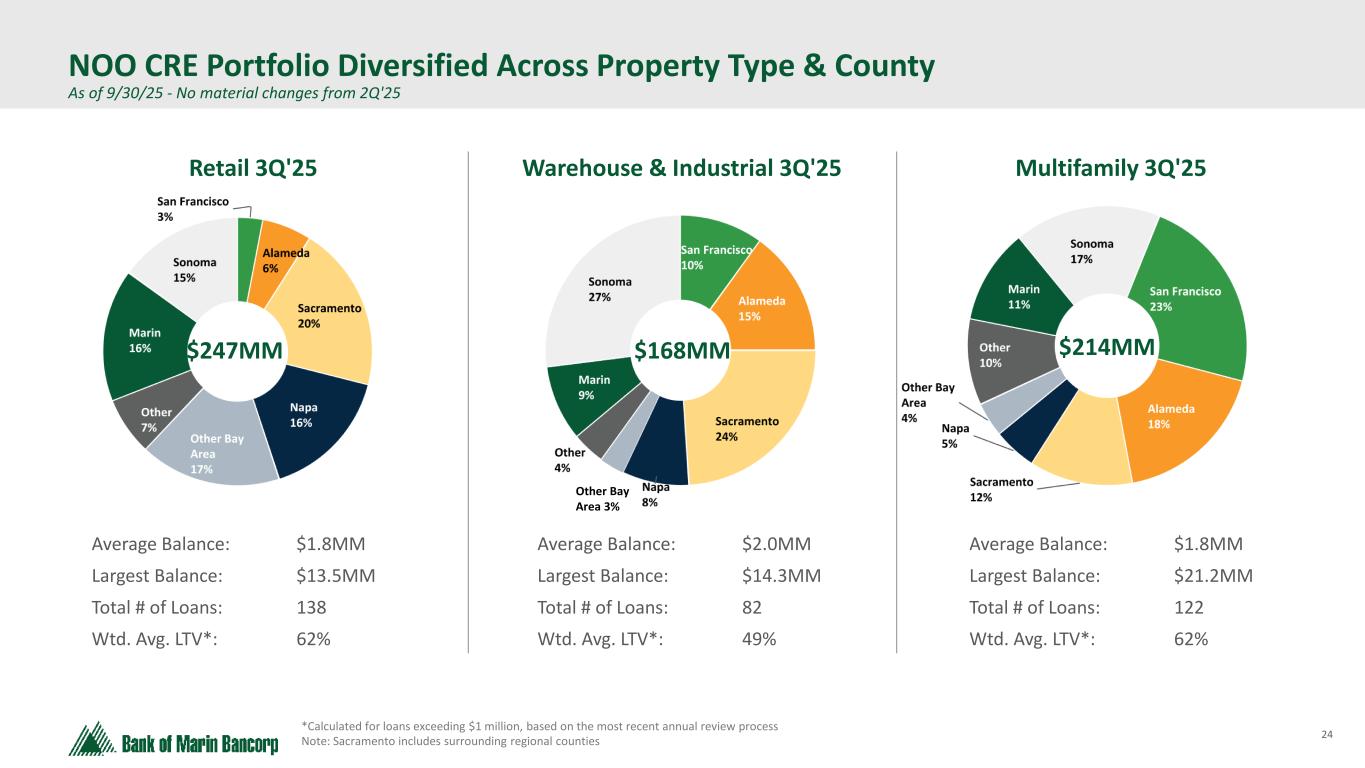 23 • $365 million in credit exposure spread across our lending footprint comprised of 149 loans • $2.4 million average loan balance – largest loan at $15.6 million • 67% weighted average loan-to-value and 1.63x weighted average debt-service coverage ratio* • City of San Francisco NOO CRE office exposure is 3% of total loan portfolio and 5% of total NOO CRE loans NOO CRE Office Portfolio by County * Calculated for loans exceeding $1 million, based on the most recent annual review process, and net of individual reserves Non-owner Occupied Office Exposure As of 9/30/25 - No material changes from 2Q'25 $365MM County of San Francisco NOO CRE Office Portfolio Total Balance: $60.7 million Average Loan Bal: $5.5 million Number of Loans: 12 loans Wtd. Average LTV*: 64% Wtd. Average DCR: 1.35x Average Occupancy: 82% 11 of the 12 loans are secured by low rise buildings and one loan is secured by a 10 story building