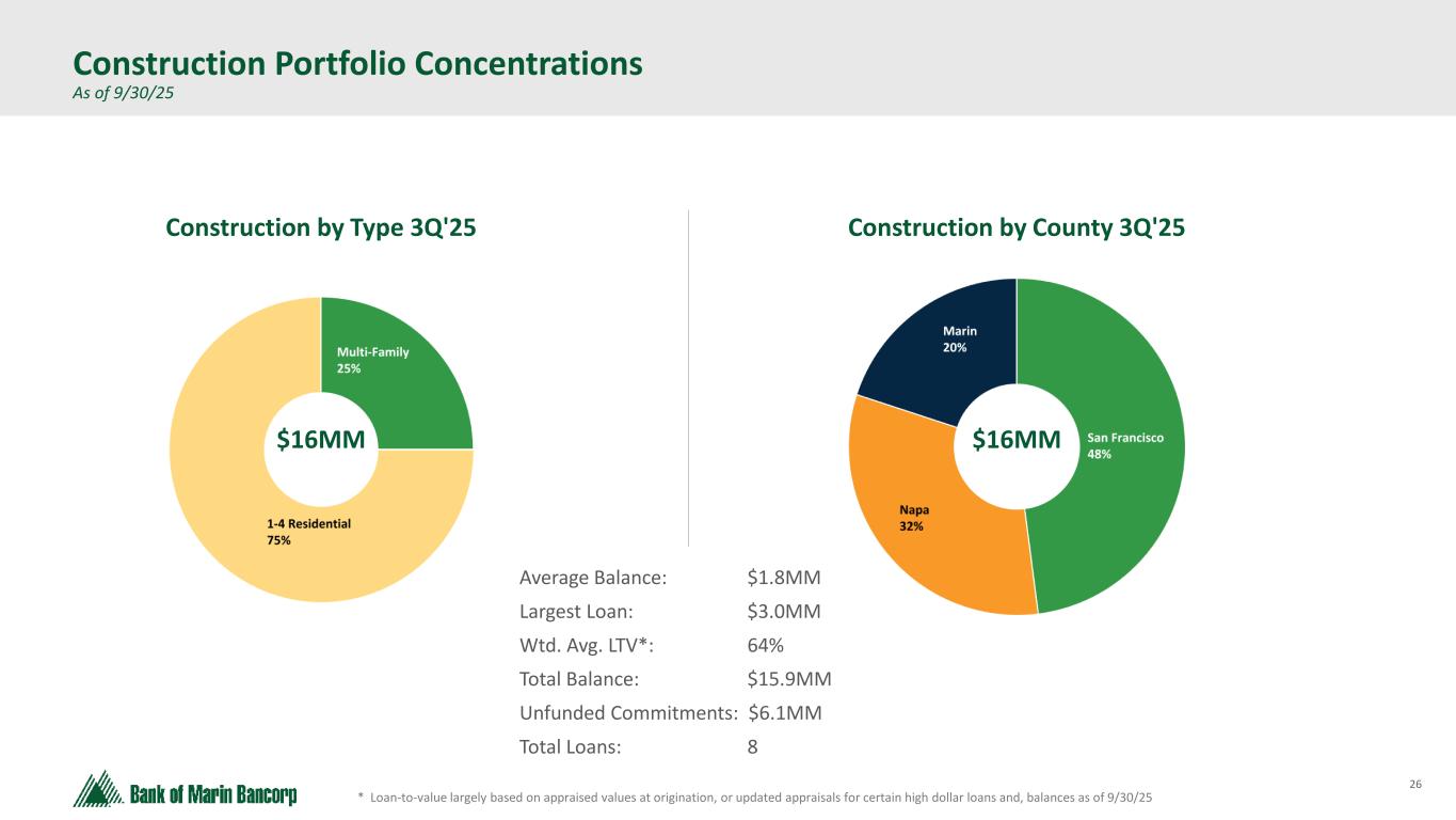 25 * Loan-to-value largely based on appraised values at origination, or updated appraisals for certain classified loans, and balances as of 9/30/25 Owner-Occupied CRE Portfolio As of 9/30/25 - No material changes from 2Q'25 OO CRE by County 3Q'25 Average Balance: $1.1MM Largest Loan: $14.6MM Wtd. Avg. LTV*: 47% Total Balance: $314.0MM Total Loans: 282 OO CRE by Type 3Q'25 $314MM $314MM Average Balance: $0.7MM Largest Loan: $7.1MM Wtd. Avg. LTV*: 55% Total Balance: $60.3MM Total Loans: 83 OO CRE Office Portfolio by County 3Q25 $60MM Mixed use 2%