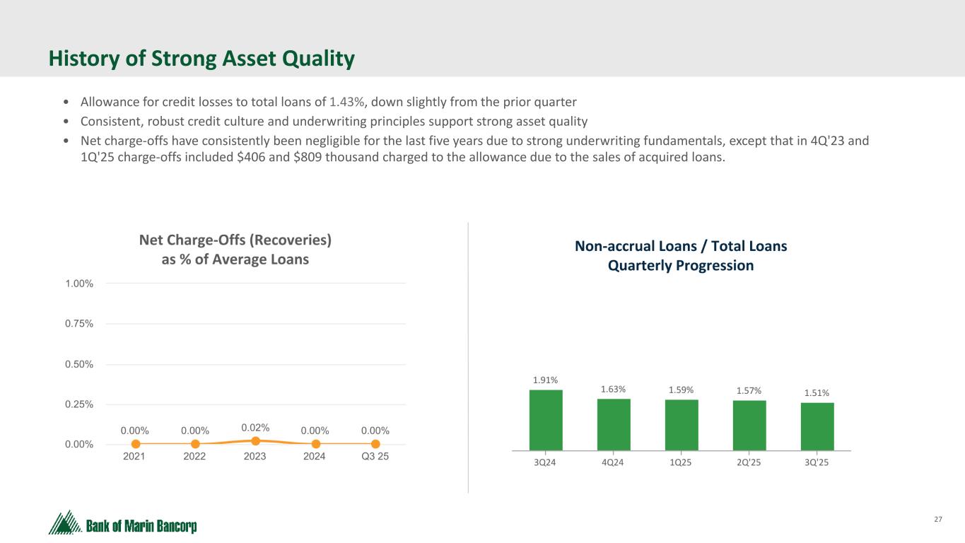 24 *Calculated for loans exceeding $1 million, based on the most recent annual review process Note: Sacramento includes surrounding regional counties NOO CRE Portfolio Diversified Across Property Type & County As of 9/30/25 - No material changes from 2Q'25 Average Balance: $1.8MM Largest Balance: $13.5MM Total # of Loans: 138 Wtd. Avg. LTV*: 62% Average Balance: $2.0MM Largest Balance: $14.3MM Total # of Loans: 82 Wtd. Avg. LTV*: 49% Average Balance: $1.8MM Largest Balance: $21.2MM Total # of Loans: 122 Wtd. Avg. LTV*: 62% Retail 3Q'25 Warehouse & Industrial 3Q'25 Multifamily 3Q'25 $247MM $168MM $214MM Other Bay Area 3%