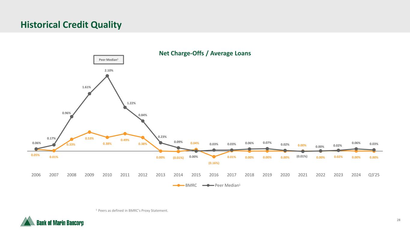 27 History of Strong Asset Quality • Allowance for credit losses to total loans of 1.43%, down slightly from the prior quarter • Consistent, robust credit culture and underwriting principles support strong asset quality • Net charge-offs have consistently been negligible for the last five years due to strong underwriting fundamentals, except that in 4Q'23 and 1Q'25 charge-offs included $406 and $809 thousand charged to the allowance due to the sales of acquired loans.