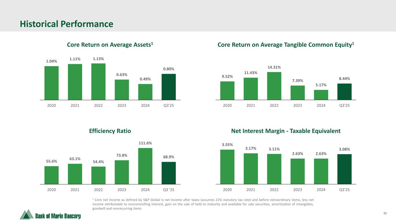 28 Historical Credit Quality 0.05% 0.01% 0.33% 0.53% 0.38% 0.49% 0.38% 0.00% (0.01%) 0.04% (0.16%) 0.01% 0.00% 0.00% 0.00% 0.00% 0.00% 0.02% 0.00% 0.00% 0.06% 0.17% 0.96% 1.61% 2.10% 1.22% 0.84% 0.23% 0.09% 0.00% 0.03% 0.03% 0.06% 0.07% 0.02% (0.01%) 0.00% 0.02% 0.06% 0.03% 2006 2007 2008 2009 2010 2011 2012 2013 2014 2015 2016 2017 2018 2019 2020 2021 2022 2023 2024 Q3'25 BMRC Peer Median 1 Peers as defined in BMRC’s Proxy Statement. 1 Net Charge-Offs / Average Loans Peer Median1