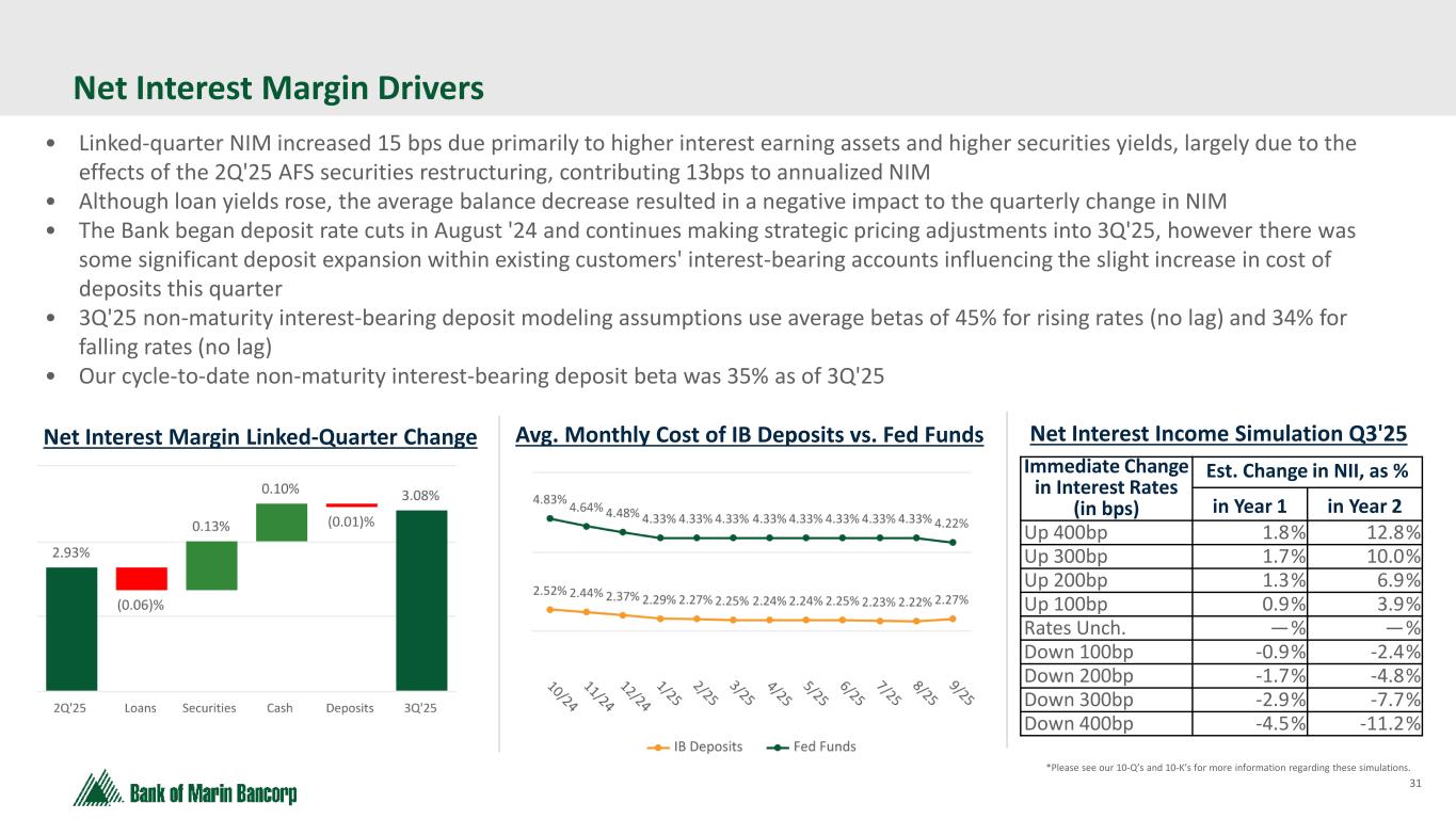 31 • Linked-quarter NIM increased 15 bps due primarily to higher interest earning assets and higher securities yields, largely due to the effects of the 2Q'25 AFS securities restructuring, contributing 13bps to annualized NIM • Although loan yields rose, the average balance decrease resulted in a negative impact to the quarterly change in NIM • The Bank began deposit rate cuts in August '24 and continues making strategic pricing adjustments into 3Q'25, however there was some significant deposit expansion within existing customers' interest-bearing accounts influencing the slight increase in cost of deposits this quarter • 3Q'25 non-maturity interest-bearing deposit modeling assumptions use average betas of 45% for rising rates (no lag) and 34% for falling rates (no lag) • Our cycle-to-date non-maturity interest-bearing deposit beta was 35% as of 3Q'25 Net Interest Margin Drivers Net Interest Margin Linked-Quarter Change Avg. Monthly Cost of IB Deposits vs. Fed Funds Immediate Change in Interest Rates (in bps) Est. Change in NII, as % in Year 1 in Year 2 Up 400bp 1.8% 12.8% Up 300bp 1.7% 10.0% Up 200bp 1.3% 6.9% Up 100bp 0.9% 3.9% Rates Unch. —% —% Down 100bp -0.9% -2.4% Down 200bp -1.7% -4.8% Down 300bp -2.9% -7.7% Down 400bp -4.5% -11.2% *Please see our 10-Q’s and 10-K’s for more information regarding these simulations. Net Interest Income Simulation Q3'25