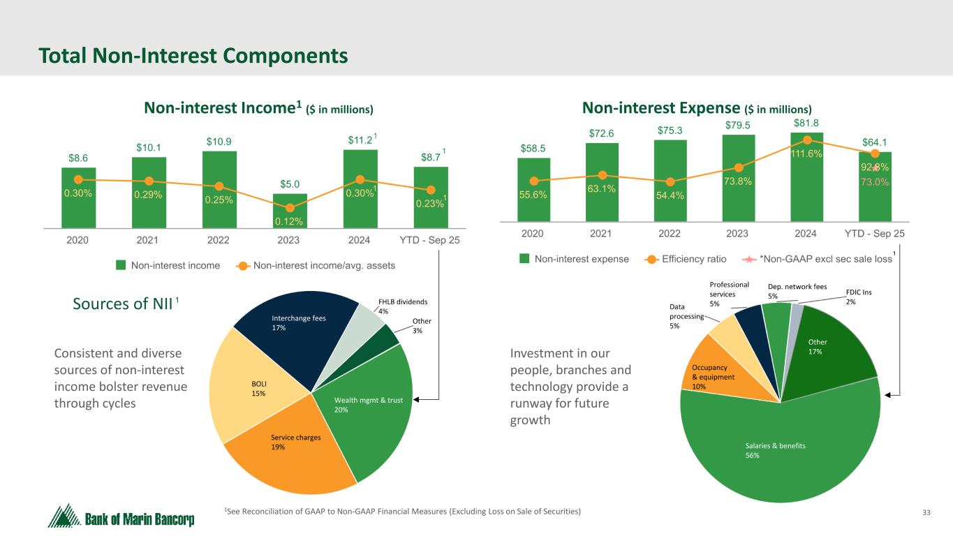 32 Loans & Securities — Repricing & Maturity $ in millions, unless otherwise indicated Total Loans1 * at 9/30/2025 Repricing Term Rate Structure 3 months or less 3-12 months 1-3 years 3-5 years 5-15 years Over 15 years Total Floating Rate Variable Rate Floating & Variable Rate at Floor Floating & Variable Rate at Ceiling Fixed Rate C&I $ 76.3 $ 7.2 $ 16.2 $ 38.4 $ 15.1 $ 1.1 $ 154.3 $ 68.6 $ 1.9 $ 12.3 $ — $ 71.5 Real estate: Owner-occupied CRE 5.2 14.4 53.5 57.6 176.6 6.7 314.0 0.9 33.1 96.4 — 183.6 Non-owner occupied CRE 95.9 73.7 209.6 419.7 520.9 4.5 1,324.3 5.6 138.8 324.4 — 855.5 Construction 7.8 8.1 — — — — 15.9 6.6 — 2.6 0.7 6.0 Home equity 95.3 — — — 0.6 — 95.9 95.3 — — — 0.6 Other residential 1.0 11.1 0.1 0.5 0.9 109.3 122.9 — 12.6 91.4 — 18.9 Installment & other consumer 1.3 2.2 6.5 2.5 50.5 0.1 63.1 1.0 7.7 9.1 — 45.3 Total $ 282.8 $ 116.7 $ 285.9 $ 518.7 $ 764.6 $ 121.7 $2,090.4 $178.0 $194.1 $536.2 $ 0.7 $1,181.4 % of Total 14 % 6 % 14 % 25 % 37 % 6 % 100 % 9 % 9 % 26 % — % 57 % Weighted Average Rate 7.08 % 4.89 % 5.04 % 5.09 % 4.59 % 4.55 % 5.11 % 1 Amounts represent amortized cost. Based on maturity date for fixed rate loans and variable rate loans at their floors and ceilings and next repricing date for all other variable rate loans. Does not included prepayment assumptions. Investment Securities2 * at 9/30/25 2 Includes both available-for-sale and held-to-maturity investment securities with prepayment assumptions applied Projected Cash Flow Distribution 3 months or less 3-12 months 1-3 years 3-5 years 5-10 years Over 10 years Total Principal (par) & interest $ 68.7 $ 166.4 $ 324.3 $ 355.5 $ 475.3 $ 181.0 $ 1,571.2 % of Total 4 % 11 % 21 % 23 % 30 % 11 % 100 %