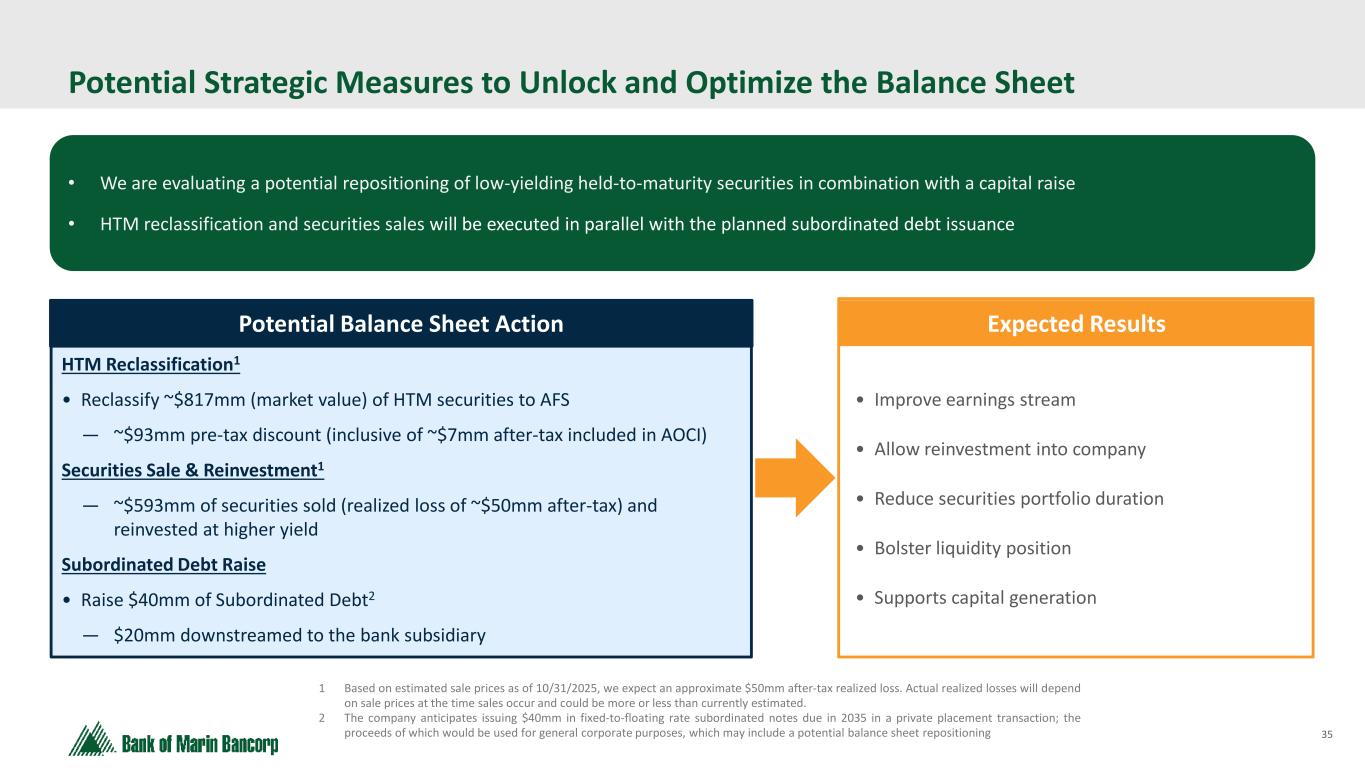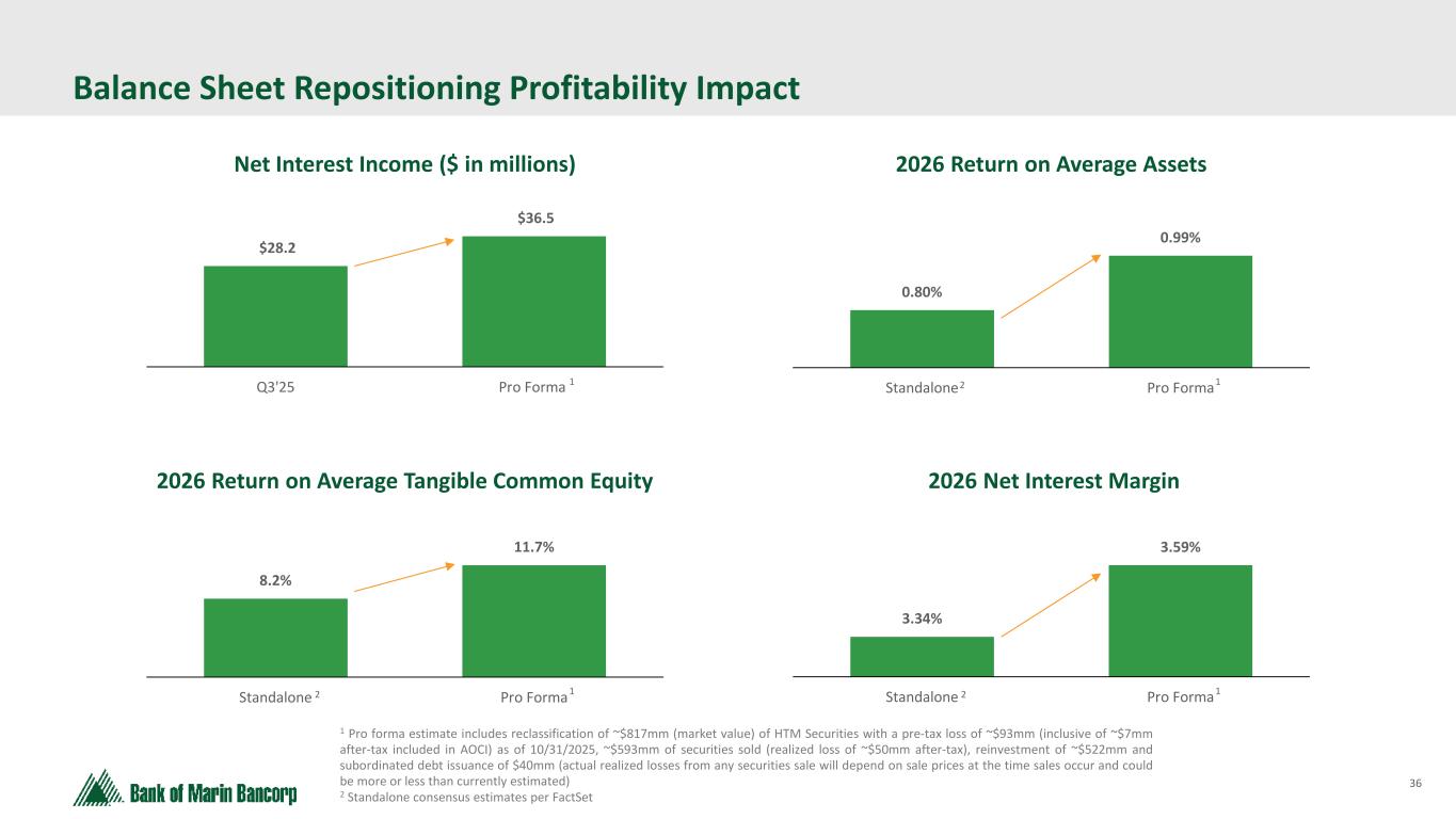 35 Potential Strategic Measures to Unlock and Optimize the Balance Sheet • We are evaluating a potential repositioning of low-yielding held-to-maturity securities in combination with a capital raise • HTM reclassification and securities sales will be executed in parallel with the planned subordinated debt issuance Expected Results HTM Reclassification1 • Reclassify ~$817mm (market value) of HTM securities to AFS — ~$93mm pre-tax discount (inclusive of ~$7mm after-tax included in AOCI) Securities Sale & Reinvestment1 — ~$593mm of securities sold (realized loss of ~$50mm after-tax) and reinvested at higher yield Subordinated Debt Raise • Raise $40mm of Subordinated Debt2 — $20mm downstreamed to the bank subsidiary • Improve earnings stream • Allow reinvestment into company • Reduce securities portfolio duration • Bolster liquidity position • Supports capital generation 1 Based on estimated sale prices as of 10/31/2025, we expect an approximate $50mm after-tax realized loss. Actual realized losses will depend on sale prices at the time sales occur and could be more or less than currently estimated. 2 The company anticipates issuing $40mm in fixed-to-floating rate subordinated notes due in 2035 in a private placement transaction; the proceeds of which would be used for general corporate purposes, which may include a potential balance sheet repositioning Potential Balance Sheet Action