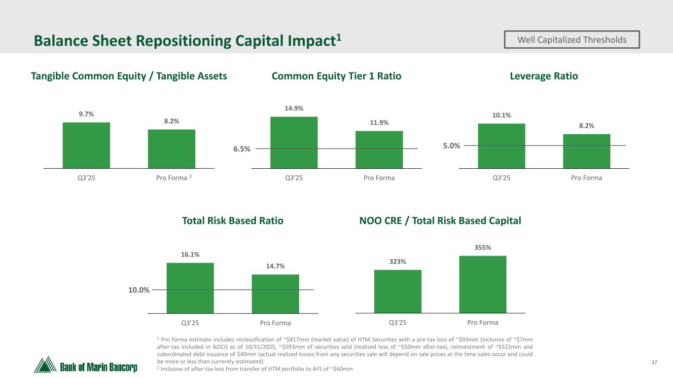 36 8.2% 11.7% Standalone Pro Forma Balance Sheet Repositioning Profitability Impact 0.80% 0.99% Standalone Pro Forma 2026 Net Interest Margin 2026 Return on Average Assets 2026 Return on Average Tangible Common Equity 1 Pro forma estimate includes reclassification of ~$817mm (market value) of HTM Securities with a pre-tax loss of ~$93mm (inclusive of ~$7mm after-tax included in AOCI) as of 10/31/2025, ~$593mm of securities sold (realized loss of ~$50mm after-tax), reinvestment of ~$522mm and subordinated debt issuance of $40mm (actual realized losses from any securities sale will depend on sale prices at the time sales occur and could be more or less than currently estimated) 2 Standalone consensus estimates per FactSet 2 2 3.34% 3.59% Standalone Pro Forma Net Interest Income ($ in millions) $28.2 $36.5 Q3'25 Pro Forma 2 1 1 11
