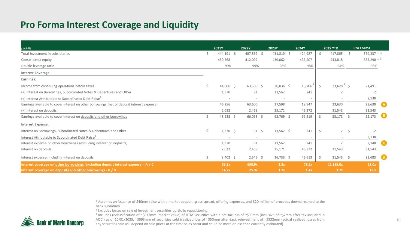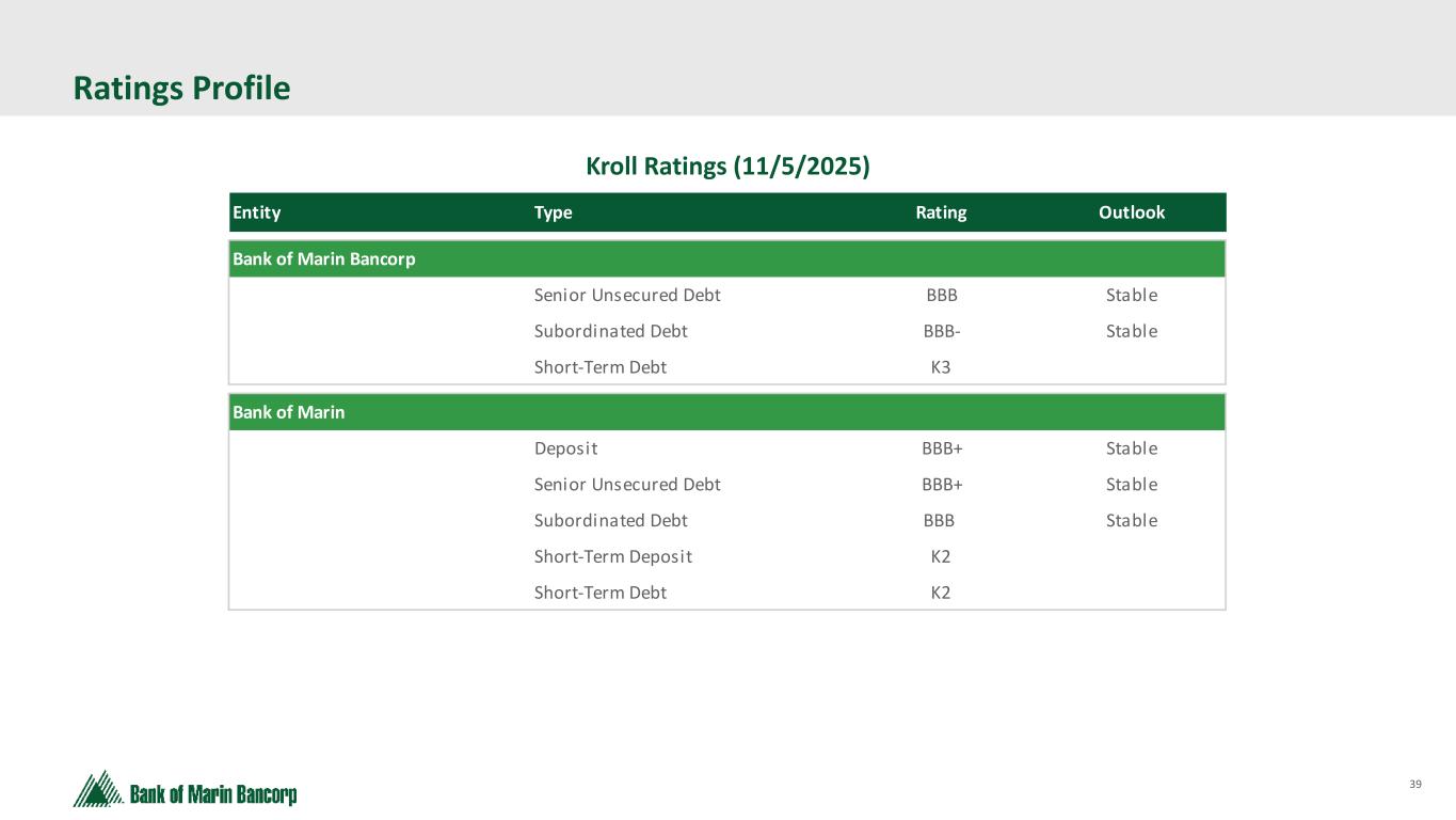 39 Ratings Profile Kroll Ratings (11/5/2025) Entity Type Rating Outlook Bank of Marin Bancorp Senior Unsecured Debt BBB Stable Subordinated Debt BBB- Stable Short-Term Debt K3 Bank of Marin Deposit BBB+ Stable Senior Unsecured Debt BBB+ Stable Subordinated Debt BBB Stable Short-Term Deposit K2 Short-Term Debt K2