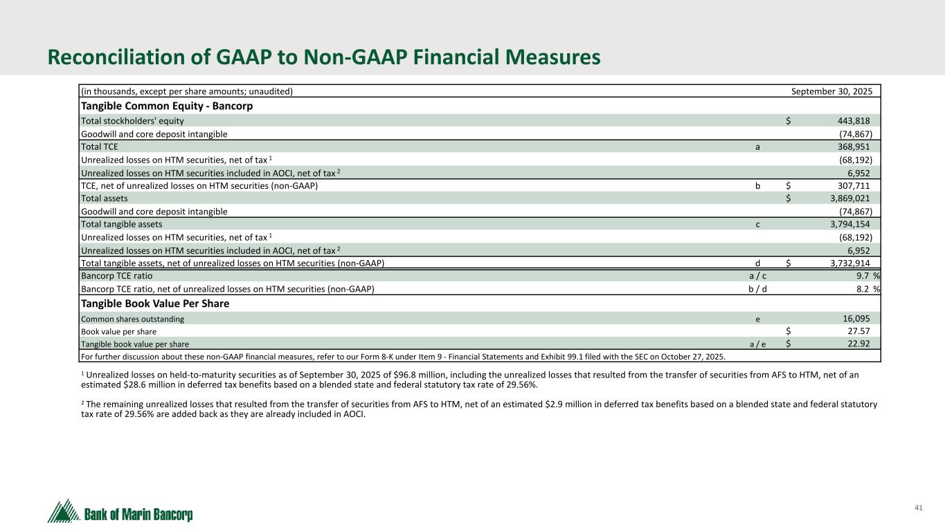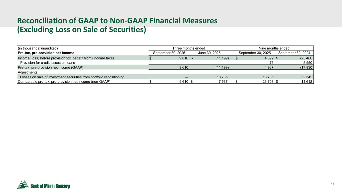 41 Reconciliation of GAAP to Non-GAAP Financial Measures (in thousands, except per share amounts; unaudited) September 30, 2025 Tangible Common Equity - Bancorp Total stockholders' equity $ 443,818 Goodwill and core deposit intangible (74,867) Total TCE a 368,951 Unrealized losses on HTM securities, net of tax 1 (68,192) Unrealized losses on HTM securities included in AOCI, net of tax 2 6,952 TCE, net of unrealized losses on HTM securities (non-GAAP) b $ 307,711 Total assets $ 3,869,021 Goodwill and core deposit intangible (74,867) Total tangible assets c 3,794,154 Unrealized losses on HTM securities, net of tax 1 (68,192) Unrealized losses on HTM securities included in AOCI, net of tax 2 6,952 Total tangible assets, net of unrealized losses on HTM securities (non-GAAP) d $ 3,732,914 Bancorp TCE ratio a / c 9.7 % Bancorp TCE ratio, net of unrealized losses on HTM securities (non-GAAP) b / d 8.2 % Tangible Book Value Per Share Common shares outstanding e 16,095 Book value per share $ 27.57 Tangible book value per share a / e $ 22.92 For further discussion about these non-GAAP financial measures, refer to our Form 8-K under Item 9 - Financial Statements and Exhibit 99.1 filed with the SEC on October 27, 2025. 1 Unrealized losses on held-to-maturity securities as of September 30, 2025 of $96.8 million, including the unrealized losses that resulted from the transfer of securities from AFS to HTM, net of an estimated $28.6 million in deferred tax benefits based on a blended state and federal statutory tax rate of 29.56%. 2 The remaining unrealized losses that resulted from the transfer of securities from AFS to HTM, net of an estimated $2.9 million in deferred tax benefits based on a blended state and federal statutory tax rate of 29.56% are added back as they are already included in AOCI.