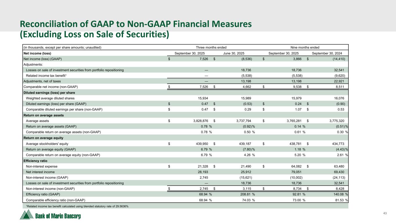 42 Reconciliation of GAAP to Non-GAAP Financial Measures (Excluding Loss on Sale of Securities) (in thousands; unaudited) Three months ended Nine months ended Pre-tax, pre-provision net income September 30, 2025 June 30, 2025 September 30, 2025 September 30, 2024 Income (loss) before provision for (benefit from) income taxes $ 9,610 $ (11,199) $ 4,892 $ (23,480) Provision for credit losses on loans — — 75 5,550 Pre-tax, pre-provision net income (GAAP) 9,610 (11,199) 4,967 (17,930) Adjustments: Losses on sale of investment securities from portfolio repositioning — 18,736 18,736 32,542 Comparable pre-tax, pre-provision net income (non-GAAP) $ 9,610 $ 7,537 $ 23,703 $ 14,612