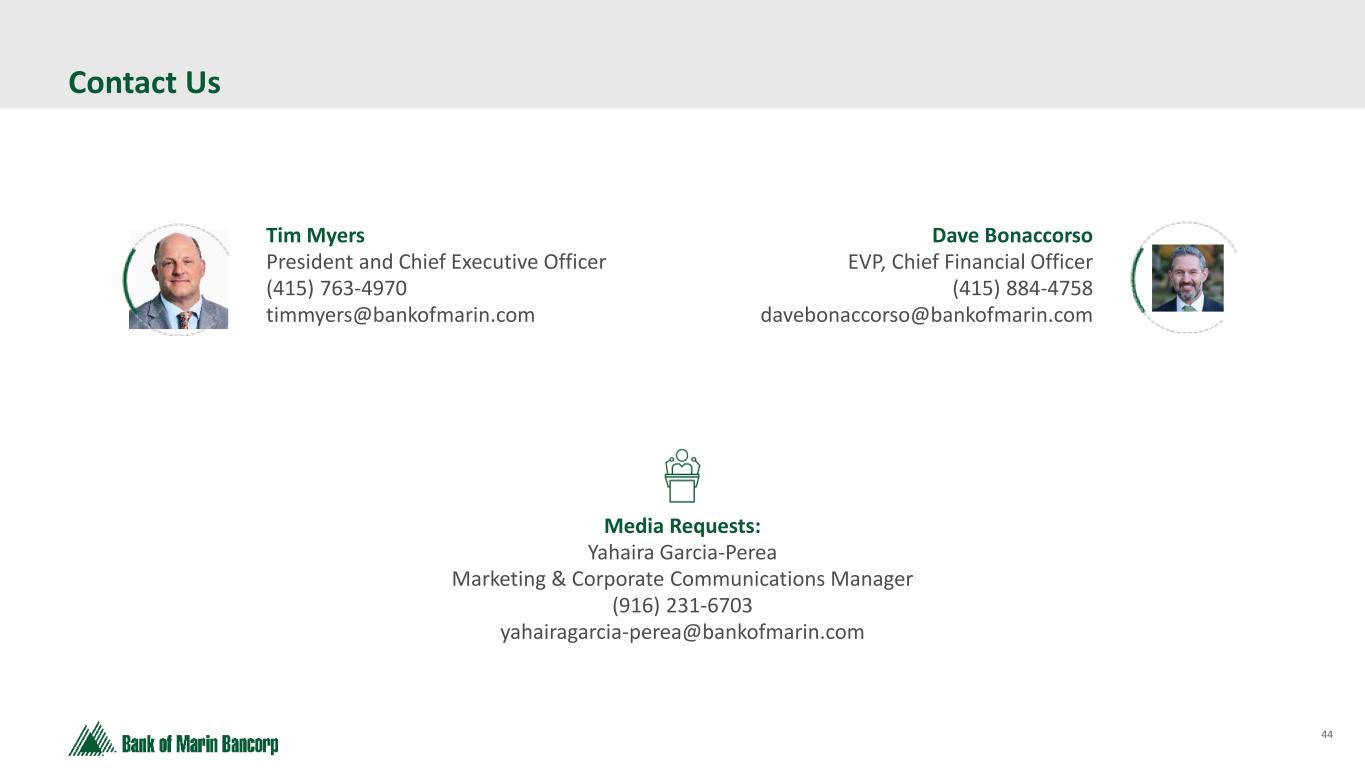 44 Contact Us Tim Myers President and Chief Executive Officer (415) 763-4970 timmyers@bankofmarin.com Dave Bonaccorso EVP, Chief Financial Officer (415) 884-4758 davebonaccorso@bankofmarin.com Media Requests: Yahaira Garcia-Perea Marketing & Corporate Communications Manager (916) 231-6703 yahairagarcia-perea@bankofmarin.com