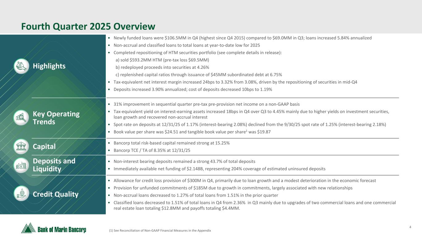 2 Text 95,96,96 Light Gray 232, 232, 232 Black 0, 0, 0 White 255, 255, 255 Accent 1 7,89,52 Accent 2 248,153,40 Accent 3 254,217,129 Accent 4 52,153,70 Accent 5 5,39,67 Accent 6 171,184,195 Forward-Looking Statements This discussion of financial results includes forward-looking statements within the meaning of Section 27A of the Securities Act of 1933, as amended, (the "1933 Act") and Section 21E of the Securities Exchange Act of 1934, as amended, (the "1934 Act"). Those sections of the 1933 Act and 1934 Act provide a "safe harbor" for forward-looking statements to encourage companies to provide prospective information about their financial performance so long as they provide meaningful, cautionary statements identifying important factors that could cause actual results to differ significantly from projected results. Our forward-looking statements include descriptions of plans or objectives of management for future operations, products or services, and forecasts of revenues, earnings or other measures of economic performance. Forward-looking statements can be identified by the fact that they do not relate strictly to historical or current facts. They often include the words "believe," "expect," "intend," "estimate" or words of similar meaning, or future or conditional verbs preceded by "will," "would," "should," "could" or "may." Forward-looking statements are based on management's current expectations regarding economic, legislative, and regulatory issues that may affect our earnings in future periods. Factors that could cause future results to vary materially from current management expectations include, but are not limited to, general economic conditions and the economic uncertainty in the United States and abroad, including economic or other disruptions to financial markets caused by the Trump administration's approach to tariffs and trade, acts of terrorism, war, impacts from inflation, supply chain disruptions, changes in interest rates (including the actions taken by the Federal Reserve to control inflation), California's unemployment rate, deposit flows, real estate values, and expected future cash flows on loans and securities; the impact of adverse developments at other banks, including bank failures, that impact general sentiment regarding the stability and liquidity of banks; costs or effects of acquisitions; competition; changes in accounting principles, policies or guidelines; changes in legislation or regulation; natural disasters (such as wildfires and earthquakes in our area); adverse weather conditions; interruptions of utility service in our markets for sustained periods; and other economic, competitive, governmental, regulatory and technological factors (including external fraud and cybersecurity threats) affecting our operations, pricing, products and services; and successful integration of acquisitions. These and other important factors detailed in various securities law filings made periodically by Bancorp, copies of which are available from us at no charge. Forward-looking statements speak only as of the date they are made. Bancorp undertakes no obligation to release publicly the result of any revisions to these forward-looking statements that may be made to reflect events or circumstances that occur after the date of this press release or to reflect the occurrence of unanticipated events. GAAP to Non-GAAP Financial Measures This presentation includes some non-GAAP financial measures as shown in the Appendix of this presentation. Please refer to the reconciliation of GAAP to Non-GAAP financial measures included in our Form 8-K under Item 9 - Financial Statements and Exhibit 99.1 filed with the SEC on January 26, 2026.