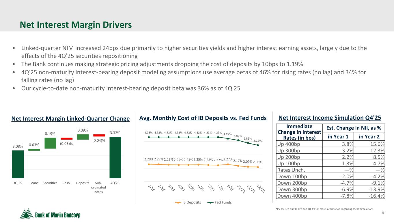 5 Text 95,96,96 Light Gray 232, 232, 232 Black 0, 0, 0 White 255, 255, 255 Accent 1 7,89,52 Accent 2 248,153,40 Accent 3 254,217,129 Accent 4 52,153,70 Accent 5 5,39,67 Accent 6 171,184,195 • Linked-quarter NIM increased 24bps due primarily to higher securities yields and higher interest earning assets, largely due to the effects of the 4Q'25 securities repositioning • The Bank continues making strategic pricing adjustments dropping the cost of deposits by 10bps to 1.19% • 4Q'25 non-maturity interest-bearing deposit modeling assumptions use average betas of 46% for rising rates (no lag) and 34% for falling rates (no lag) • Our cycle-to-date non-maturity interest-bearing deposit beta was 36% as of 4Q'25 Net Interest Margin Drivers 3.08% 0.03% 0.19% (0.03)% 0.09% (0.04)% 3.32% 3Q'25 Loans Securities Cash Deposits Sub- ordinated notes 4Q'25 Net Interest Margin Linked-Quarter Change 2.29% 2.27% 2.25% 2.24% 2.24% 2.25% 2.23% 2.22% 2.27% 2.17% 2.09% 2.08% 4.33% 4.33% 4.33% 4.33% 4.33% 4.33% 4.33% 4.33% 4.22% 4.09% 3.88% 3.72% IB Deposits Fed Funds 1/25 2/25 3/25 4/25 5/25 6/25 7/25 8/25 9/25 10/25 11/25 12/25 Avg. Monthly Cost of IB Deposits vs. Fed Funds Immediate Change in Interest Rates (in bps) Est. Change in NII, as % in Year 1 in Year 2 Up 400bp 3.8 % 15.6 % Up 300bp 3.2 % 12.3 % Up 200bp 2.2 % 8.5 % Up 100bp 1.3 % 4.7 % Rates Unch. — % — % Down 100bp -2.0 % -4.2 % Down 200bp -4.7 % -9.1 % Down 300bp -6.9 % -13.9 % Down 400bp -7.8 % -16.4 % *Please see our 10-Q’s and 10-K’s for more information regarding these simulations. Net Interest Income Simulation Q4'25
