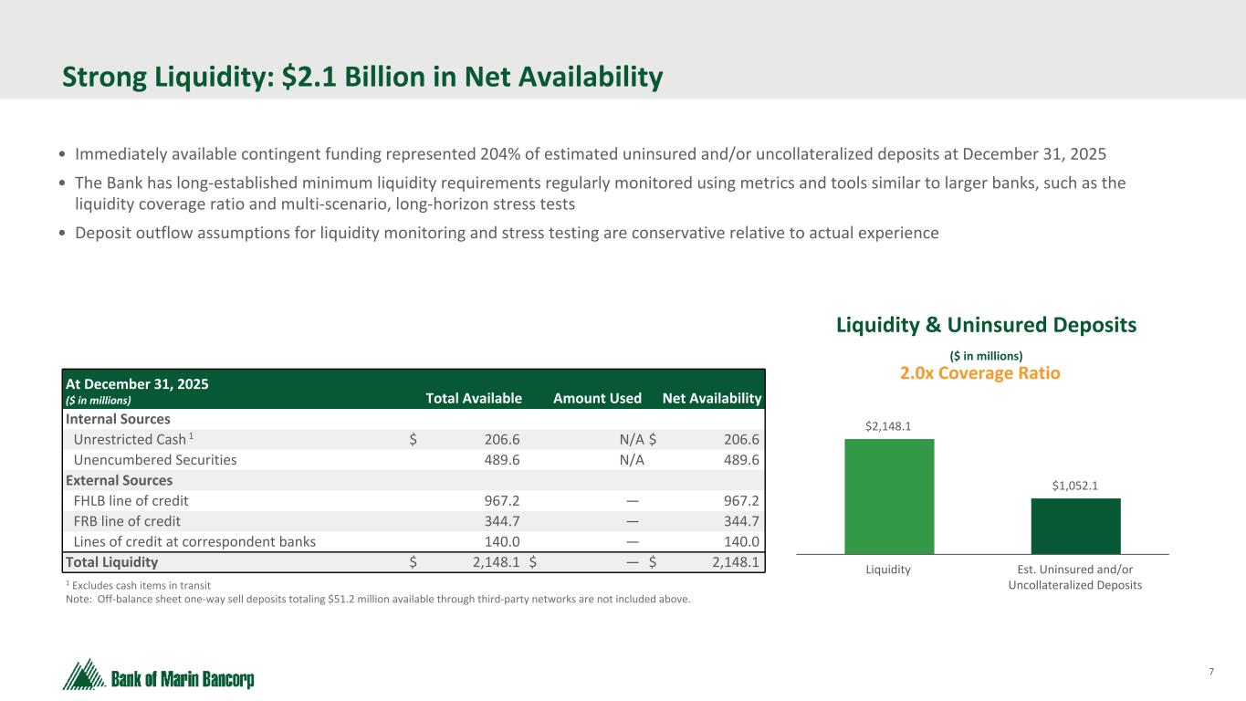 6 Text 95,96,96 Light Gray 232, 232, 232 Black 0, 0, 0 White 255, 255, 255 Accent 1 7,89,52 Accent 2 248,153,40 Accent 3 254,217,129 Accent 4 52,153,70 Accent 5 5,39,67 Accent 6 171,184,195 Robust Capital Ratios As of 12/31/25 • We maintained high capital levels and are in a position of strength • Total risk-based capital of 15.3% • Tangible common equity ratio of 8.4% • During 4Q'25 we issued $45 million of subordinated notes to replenish capital ratios that were impacted by the securities losses incurred as a result of the repositioning of our balance sheet * See Reconciliation of Non-GAAP Financial Measures in the Appendix. 6.5% 8.0% 10.0% 5.0% 12.7% 12.7% 13.9% 8.5% 8.6% 12.3% 12.3% 15.3% 8.3% 8.4% Well Capitalized Threshold Bank of Marin Bank of Marin Bancorp Common Equity Tier- One Risk-Based Capital Total Tier-One Risk- Based Capital Total Risk-Based Capital Tier-One Leverage Tangible Common Equity